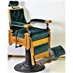 Antique barber chairc. 1900-1910, nicely restored, oak frame with applied carvings, professionally reupholstered, button tufted in dark green velve
