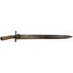 19th C. German hunting cutlassmarked on cross guard but unreadable, 19" blade, stag handle, iron cross guard, clam shell and pommel cap. Good...
