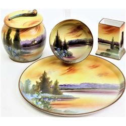 Scarce 4 piece smoking sethand painted Nippon with "M" in wreath stamp. Includes tobacco humidor, match holder, ashtray and tray to hold...