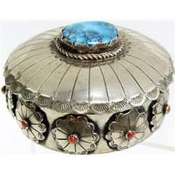 Fine vintage Navajo jewelry boxsterling silver with turquoise nugget bevel set in lid the lower 10 red coral bezel set conchos. Inner lid is finishe