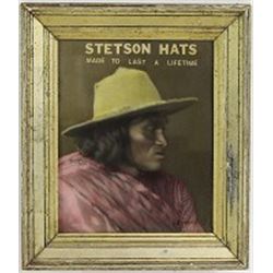 Original hand colored Carl Moon"Stetson Hats Made to Last a Life Time" advertiser featuring image of Do Gow half Apache and half Mexica...