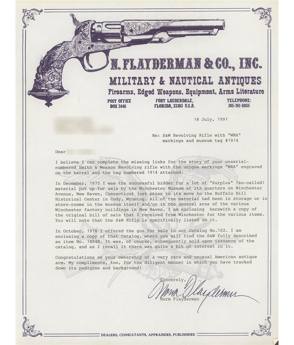This fully documented historic Smith & Wesson Model 320 revolving rifle served as a cartridge test model for the Winchester factory and was also once part of the Winchester Museum collection. In the included letter from the Cody Firearms Museum, Curator Cameron Laughlin states that the original factory museum catalog card confirmed that this Model 320 without a serial number is chambered for the .320 S&W rifle cartridge, has a 16 inch barrel with a 1 13/26 inch cylinder and was from the Winchester ballistic lab with the date 2-1-49. Laughlin concludes that the 2-1-29 "date refers to the date of transfer of this arm from the WRA ballistics laboratories--in which it was likely used for ammunition testing--to the factory museum. The piece remained in Winchester Museum collection until, perhaps, the 1960's. A more specific date of sale or transfer from Winchester is unknown, but the rifle was not present in the factory collections transferred to this institution in 1976." He also states that the trigger guard tag numbered 1914 on this rifle is from the Winchester Museum. A letter from noted S&W historian and author Robert J. Neal also confirms the historical significance of this firearm: "I have no doubt that this rifle is indeed the one mentioned on page 96 of the revised edition of the book 'Smith & Wesson 1857-1945' written by myself and Roy Jinks." The included S&W factory letter states "there are no records in Smith & Wesson's files for this rifle, the documentation you have from the Cody Firearms Museum is better than anything we can provide." In this letter noted S&W historian and author Roy Jinks concludes that this Model 320 was an early production firearm. Finally, a letter for the late noted firearms expert and author Norm Flayderman provides the details regarding the ownership of the firearm. Flayderman states that in December 1975 he was "the successful bidder for a lot of 'Surplus' (so-called) material put up for sale by the Winchester Museum" before its move to the Buffalo Bill Historical Center. Flayderman later sold the gun in his Catalog No. 102 in October 1978. The revolving rifle has a blade front sight and a two leaf folding rear sight on a solid rib marked with the two line S&W address/patent date marking. The top strap is script engraved with the Winchester factory marking: "W.R.A. Co." The rifle appears to have been left in the white with a casehardened hammer and trigger guard. As stated there are no serial numbers present. The barrel is fitted with a checkered hard rubber red mottled forearm with the S&W monogram on the underside and the frame is fitted with checkered diamond pattern walnut grips. The Circassian walnut stock features a checkered hard rubber buttplate with the S&W monogram. With a brass tipped wooden cleaning rod. Note that this Model 320 has a 16 inch barrel. It has been estimated that 239 Model 320s were manufactured with a 16 inch barrel, making it an even rarer example of a S&W manufactured firearm.