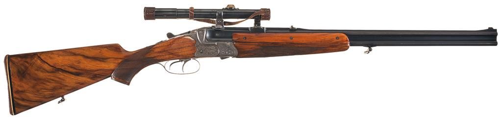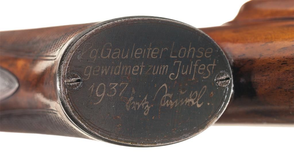 This is an example of a pre-war elaborately factory engraved Nazi presentation double rifle manufactured by the Berlin-Suhler Waffen und Fahrzeugwerke (BSW) factory circa 1936/37. This exceptional rifle was presented by Fritz Sauckel, Gauleiter of Thuringen (from 1927-45) to Hinrich Lohse, who was the Gauleiter of Schleswig-Holstein (from 1925-45). Fritz Sauckel was an early Nazi Party member, joining in 1921, very powerful Gauleiter during WWII and was a favorite of Hitler throughout WWII. He was tried at Nuremberg, found guilty of Nazi war crimes and crimes against humanity, and hanged in 1946. The history of the BSW company has always been clouded in controversy. The company was original started in the late 1800s, as the Simson and Company, Suhl Germany. They were a smaller producer of weapons and replacement parts both prior to and after WWI. After the rise of the Nazi regime in 1933 the company was confiscated and some equipment used to manufacture Luger parts were sent to the new Mauser factory with the remaining equipment designated for making sporting/hunting rifles and shotguns. The company was renamed the BSW company and did make K98 rifles during the war. This rifle features full master level deluxe engraving that covers 95% of the receiver, upper tang and trigger guard bow. The engraving itself is beautifully executed and features an extremely tight English scroll type engraving with a beautifully executed geometric pattern on all the borders and edges. All the main and locking screw heads are properly indexed and also beautifully engraved. Both sides of the receiver are deep relief engraved that depict game scenes of a pair of European Boars in a woodland scene on the left side and a pair of European Red Stags in a woodland scene on the right side. The underside is marked "BSW" in an oval. Both barrels are chambered in 7X57mm and the top barrel has a solid matte finish sighting rib with a set of factory installed double claw bases. Each side of the upper breech end of the barrel is factory inscribed "BSW" circled by "BERLIN SHULER WAFFEN UND FAHRZEUGWERKE" and "SUHL". The lower breech area of the left barrel is marked "7 X 57 R" and the matching serial number "42220" is stamped on the underside of the bottom barrel, the left side of the lug, the left edge of the receiver and inside the forend hanger assembly. Equipped with an original factory installed Zeiss "Zielklein" small/target scope. The top of the scope body is correctly marked "CARL ZEISS/JENA/ Zielklein/Nr.55481" and includes the original leather scope covers. Mounted with a multi-point checkered European walnut three piece forearm and pistol grip stock with an oval cheekpiece, solid recoil pad, sling swivel and grip cap inscribed in old German: "Kg. Gauleiter Lohse/gewidmet zum julfest/1937/(signed) Fritz Sauckel"; loosely translated "Presented/Dedicated to Gauleiter Lohse during the winter festival of 1937 by Fritz Sauckel". Comes with an article on the Simson family and history of the factory. The original horn buttplate was removed and an American White-Line rubber pad has been added to the butt, however the length of pull is still 14 1/4 inches so it doesn't appear to have been shortened.