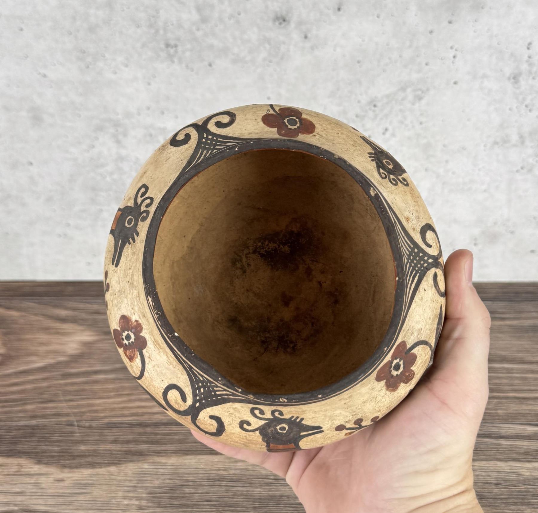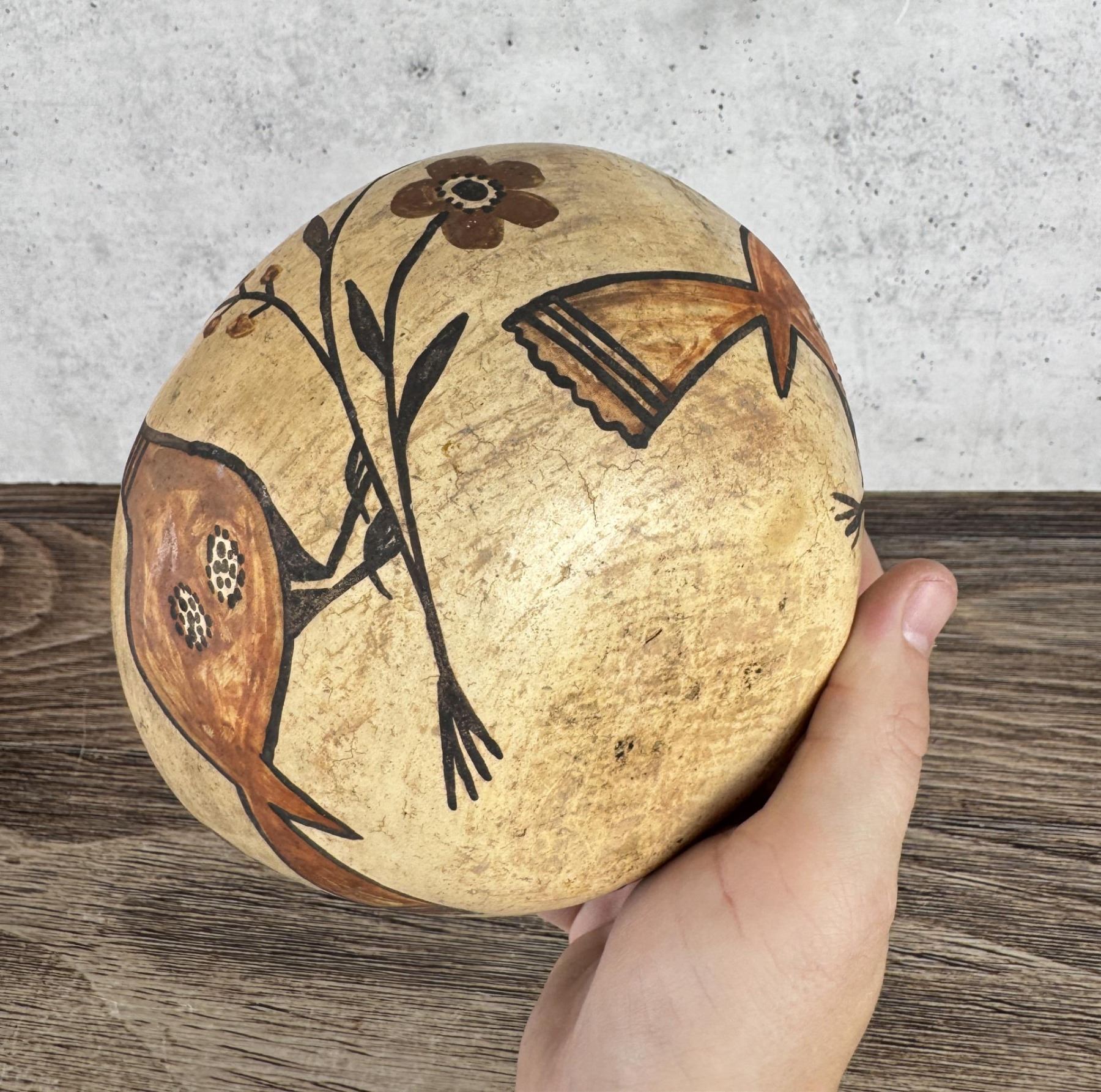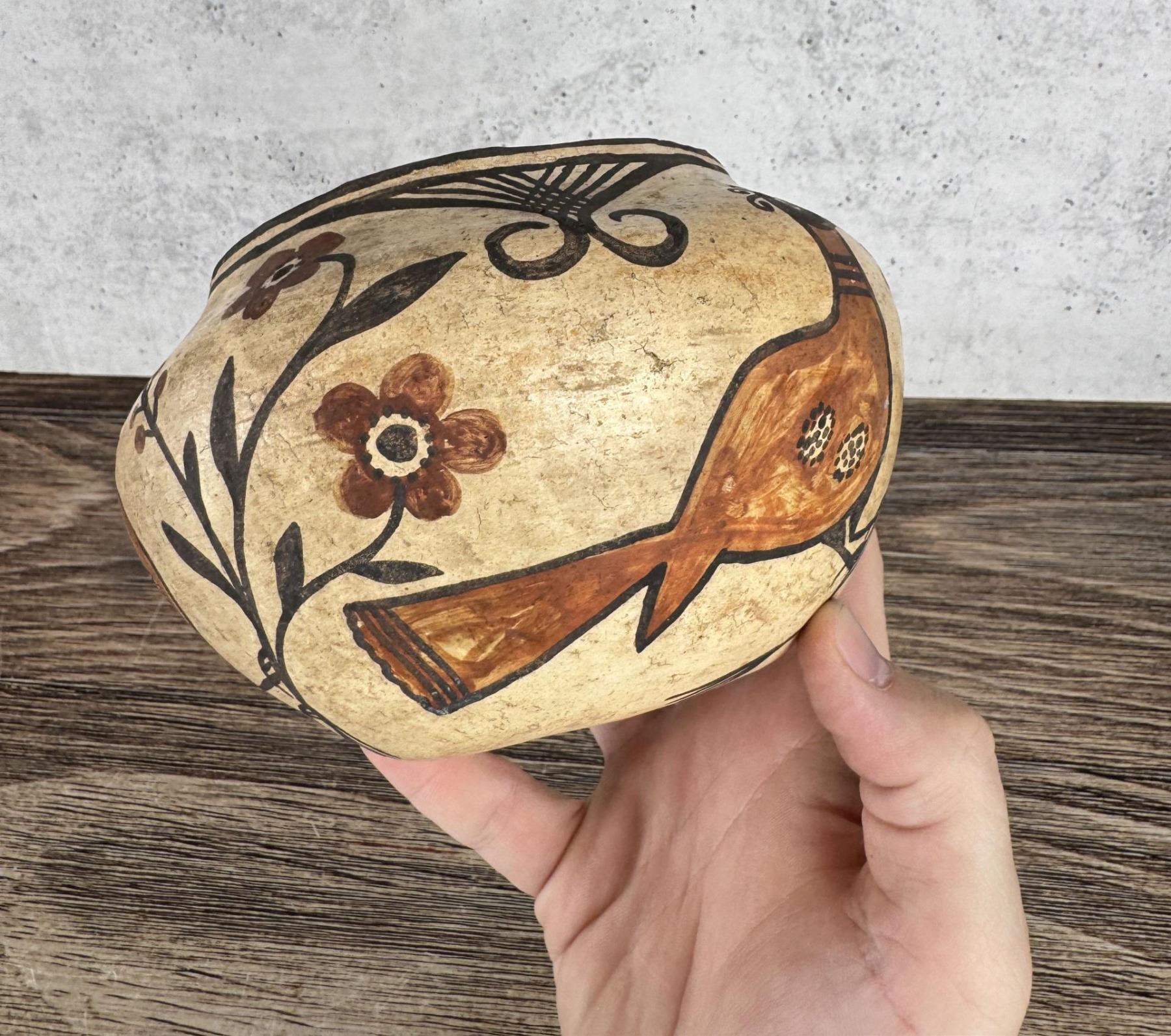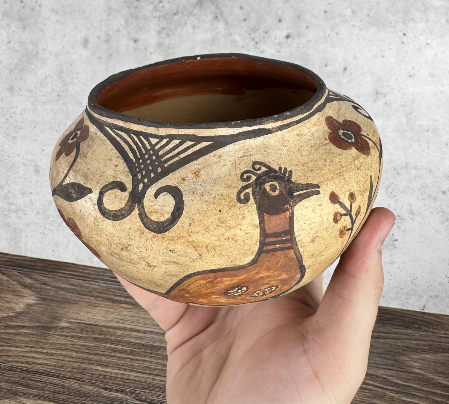 3 5/8" tall by 6" in diameter. Small hairline crack as shown.