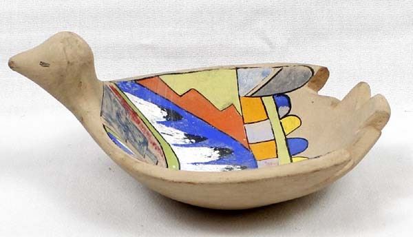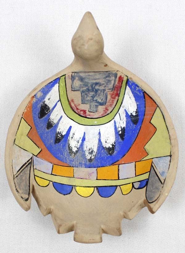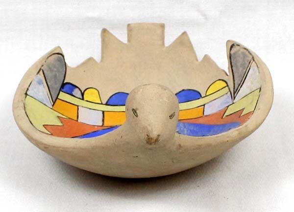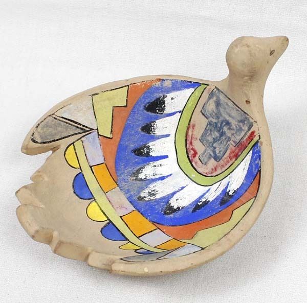 Historic Native American Jemez Pueblo Pottery Bird Bowl, poster paint, measures 1.5'' x 7''L x 5.5''W, post 1900s