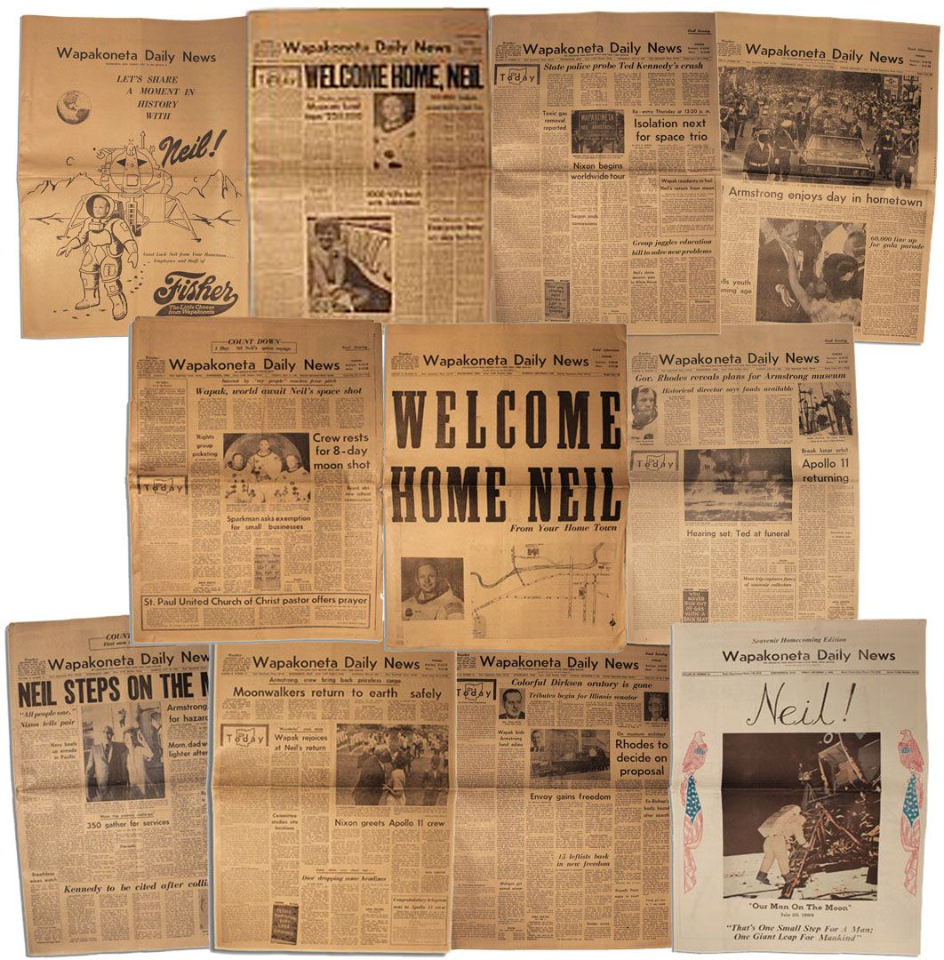 Collection of nine newspapers from Neil Armstrong's Ohio hometown, chronicling the 1969 Apollo 11 mission. The ''Wapakoneta Daily News'' issues include such headlines as ''Neil Steps on the Moon'', 21 July 1969; ''Moonwalkers return to earth safely'', 24 July 1969; and ''Neil Armstrong enjoys day in hometown'', 7 September 1969. Also depicted are numerous photographs of the Apollo 11 astronauts and Armstrong's parents. All newspapers, measuring 16'' x 22.5'', have even toning, some edge wear, and expected newspaper folds. Very good overall.