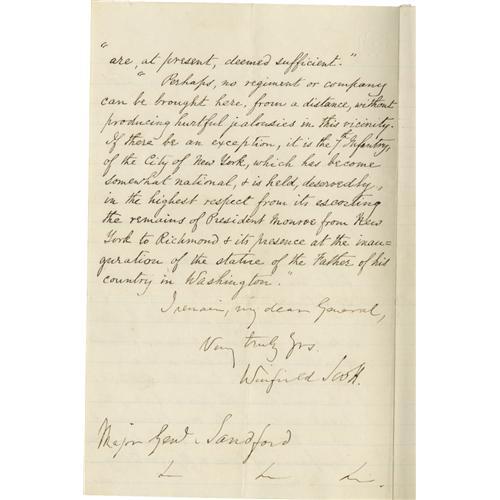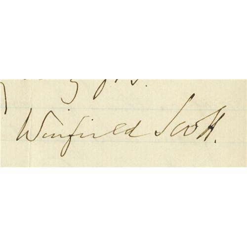 <B>Historic Military Content Winfield Scott Letter Signed,</B></I> 2pp., 5" x 8.25", Washington, January 19, 1861, to Maj. Gen. Charles W. Sandford (1796-1878). In this letter, Scott identifies the threat to the vulnerable capital, and asks specifically for the Seventh New York State Militia, one of the best-trained and outfitted peace-time regiments in the country. The letter reads in full: "I have written to his Excellency Governor Morgan, on the subject referred to in your letter, and took the liberty of advising him to confer with you upon the subject of organization. I quote, for your information, the first two paragraphs of that letter, as follows: 'I am very sure that the President <B>uchanan , as yet, has not seriously thought of calling for volunteers of militia from any quarter beyond this district, & to maintain the peace here, the local militia, the constabulary & some 700 regulars - including three companies of horse or flying artillery are at present, deemed sufficient. Perhaps, no regiment or company can be brought here, from a distance, without producing hurtful jealousies in this vicinity. If there be an exception, it is the 7th Infantry, of the City of New York, which has become somewhat national, & is held, deservedly, in the highest respect from its escorting the remains of President Monroe from New York to Richmond & its presence at the inauguration of the statues of the Father of his country in Washington." In Scott's hand: <I>"I remain, my dear General, Very truly yrs, Winfield Scott".</B></I> <BR><BR>The famous 7th Infantry of New York city dates its origin from April, 1806, when Companies A, B, C and D, were organized at the time of the excitement created by the British firing on American vessels off Sandy Hook. At the beginning of 1861, it was known as one of the best appointed and drilled militia regiments then in existence. It was composed of excellent men and equipment, all its members being young men engaged in active business pursuits in NYC, and was the first New York regiment to leave for the front. Its departure for Washington, April 19, 1861 - the three months lapse after Scott's initial request in this letter, due most likely to indecision on behalf of President Buchanan - was attended by scenes of great excitement and enthusiasm, its line of march through the streets of New York met with cheers of encouragement from the citizens. <BR><BR>News of the riot in Baltimore, in which some of the soldiers of the 6th Massachusetts were killed, was received before the regiment left New York, and the members were each provided with 48 rounds of ball-cartridge. On reaching Philadelphia orders were received to deviate from the route through Baltimore, as it was highly important that the regiment should reach Washington as soon as possible. <BR><BR>A superb military letter from Winfield Scott of immense historical significance. In fine condition, and worthy of inclusion in the finest collections of Civil War manuscripts.<BR><BR><b>Shipping:</b> Flat Material, Small (<a target="_blank" href="http://www.heritageauctions.com/common/shipping.php">view shipping information</a>)