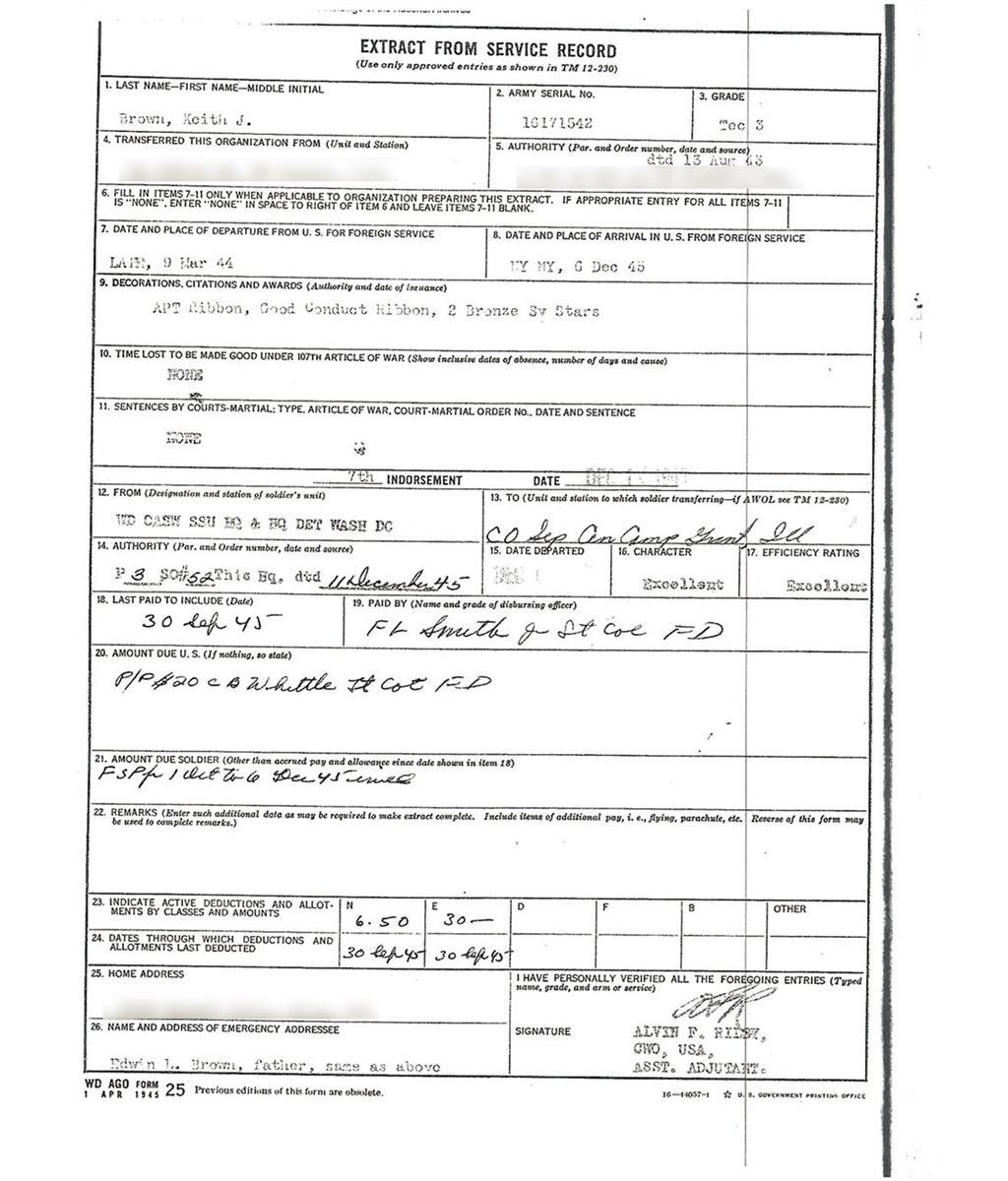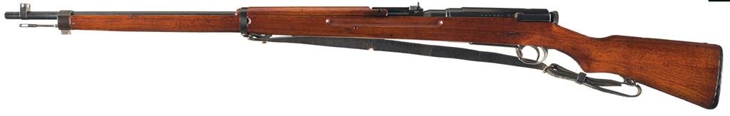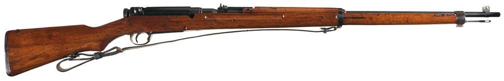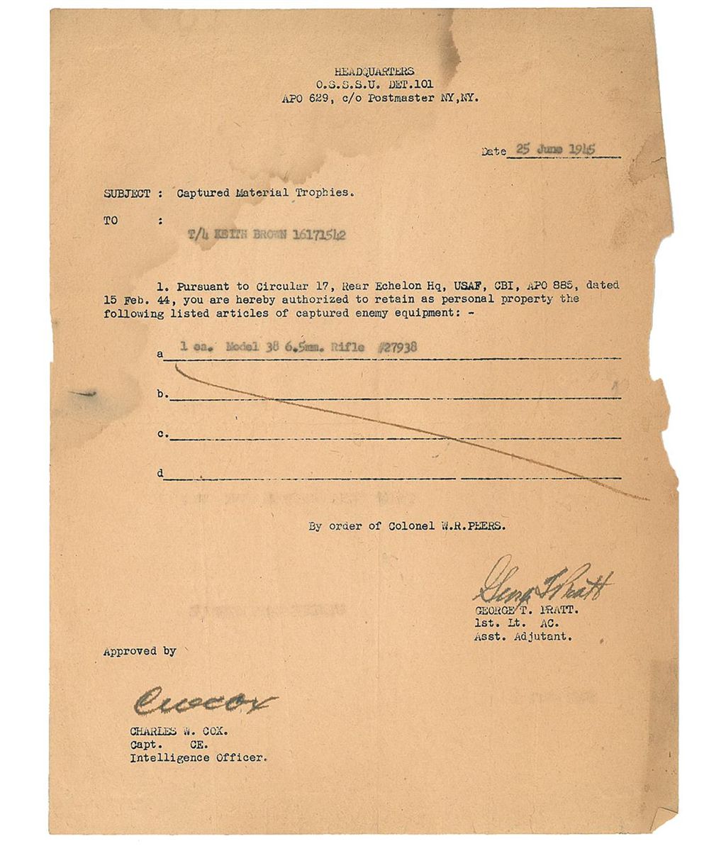 This is an exceptional example of a Nagoya Arsenal Type 38 Series 27 rifle. The top of the receiver is marked with a crisp and clear mum over the Type 38 marking, and the left side is marked with the Series symbol, serial number and arsenal marking. Inverted "v" front sight with guards and folding ladder rear sight. Mounted with a smooth pistol grip stock with a brown leather sling. With a capture certificate made out to a Technician Keith J. Brown, dated 25 June 1945 for this rifle, as well as two shoulder patches, one in the China-Burma-India style, and another marked "USA/JINGPAW/RANGERS". The capture paper is headed for OSSSU Detachment 101, which performed guerilla warfare, target marking, and aircrew rescue in the CBI Theatre, chiefly Burma, and bears the names of Colonel W.R. Peers (Det. 101's CO after 1943), Lieutenant Pratt and Captain Cox (both identified as OSS men). Also included are photocopies from Brown's enlistment records, which include records of his assignment to Detachment 101. To our knowledge we have never seen capture papers from an OSS unit. From the Putnam Green Collection.