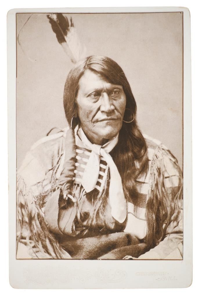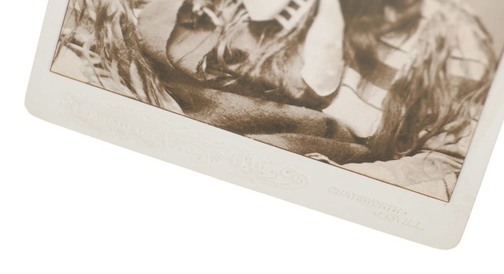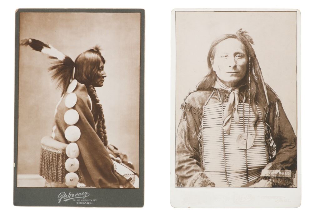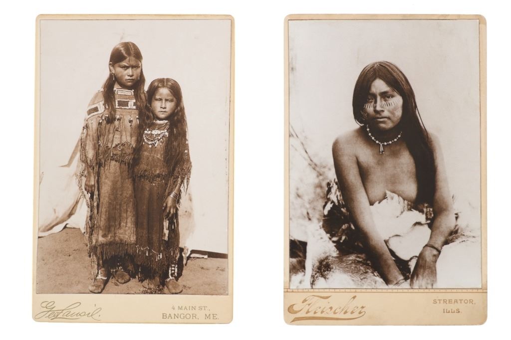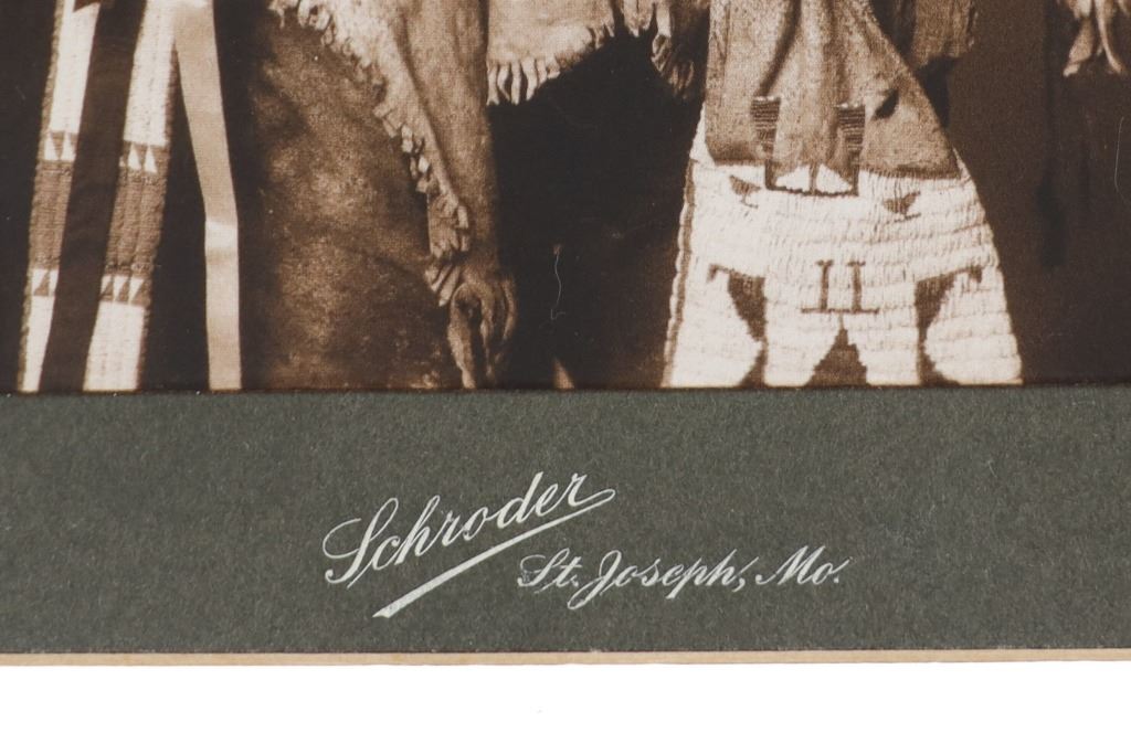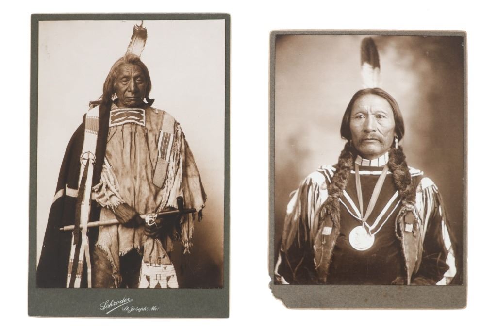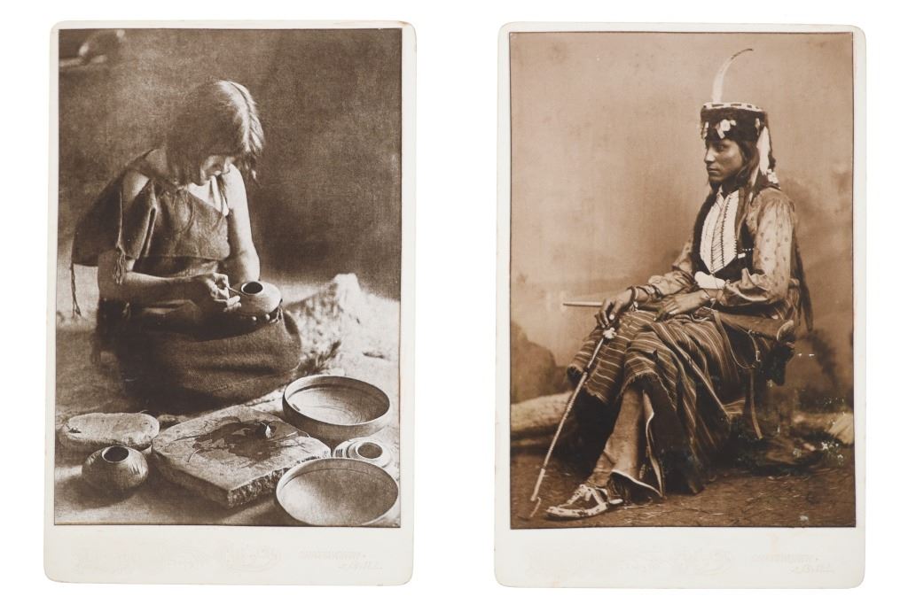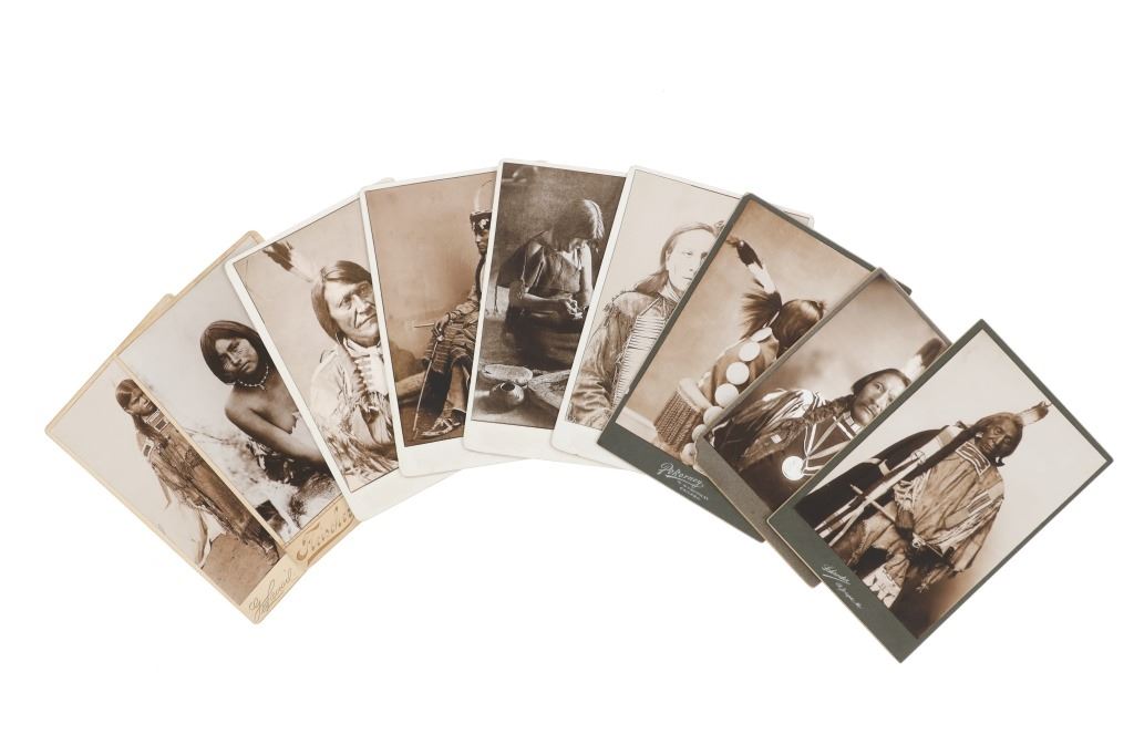 The lot features a collection of nine cabinet cards with later photos of some of the most important and historic Native American’s of the West during the 19th-century. The images include Sapiah (also known as Charles Buck and Buckskin Charley, Southern Ute Chief 1840-1936), Big Mouth Hawk an Arapaho warrior photo taken by Alexander Gardener circa 1872, Short Bull a Sicangu Lakota (1845-1915), Edward S. Curtis The Potter 1906 image, Sitting-in-the-Saddle (otherwise known as Tau-ankia / Tau-ankia-Tibone, the son of Lone Wolf) photo taken by William Stinson Soule circa 1867, image of a Native Woman by William Dinwiddie (1867-1934), Brule Lakota Chief Two Strikes (1831-1915) taken when he and others were delegates to Washington DC in 1872, Comanche Chief Quanah Park’s Daughter Wanda Parker taken in Oklahoma circa 1891, and lastly Oglala Lakota Chief Red Cloud (1822-1909) taken by Frank A. Rinehart in 1898. The cabinet card stock is all original with various different photographer and gallery markings, but the images appear to be contemporary. The cabinet card makers are as such: Schroder St. Joseph, Misouri (Red Cloud image); Pokorney 771 W. Madison St. Chicago (Big Mouth Hawk image); Lovingfoss L.C.W. Chatsworth, Illinois (Short Bull image), also Lovingfoss for the E.S. Curtis woman, Sitting in the Saddle, and Chief Two Strikes images; P. Fleischer Photographer Streator, Illinois; and George Lansil 4 Main St., Bangor, Maine. While these images and cabinet cards display wonderfully the images are all contemporary. Largest measures about 6.5-inches by 4 3/8-inches.