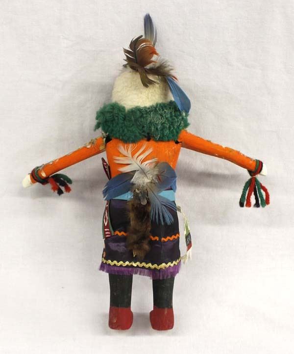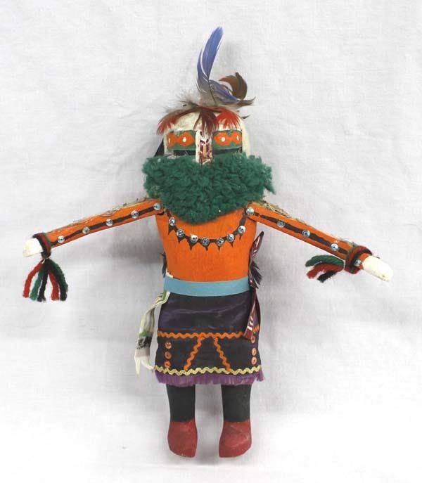 Historic Native American Hopi Kachina, measures 9.5'' x 10'' x 2.5'', embellished with yarn, sequins, cloth, faux fur, and feathers