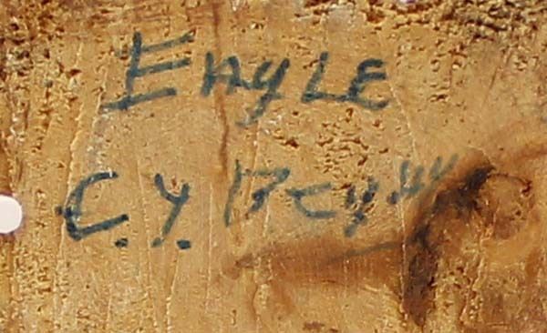 Historic Navajo Route 66 Eagle Kachina by C. Y. Begay, measures 11''H x 10.5''W x 6''Deep, signed on the bottom, old trading post Kachina, embellished with rabbit fur, leather, feathers, missing some feathers on left arm