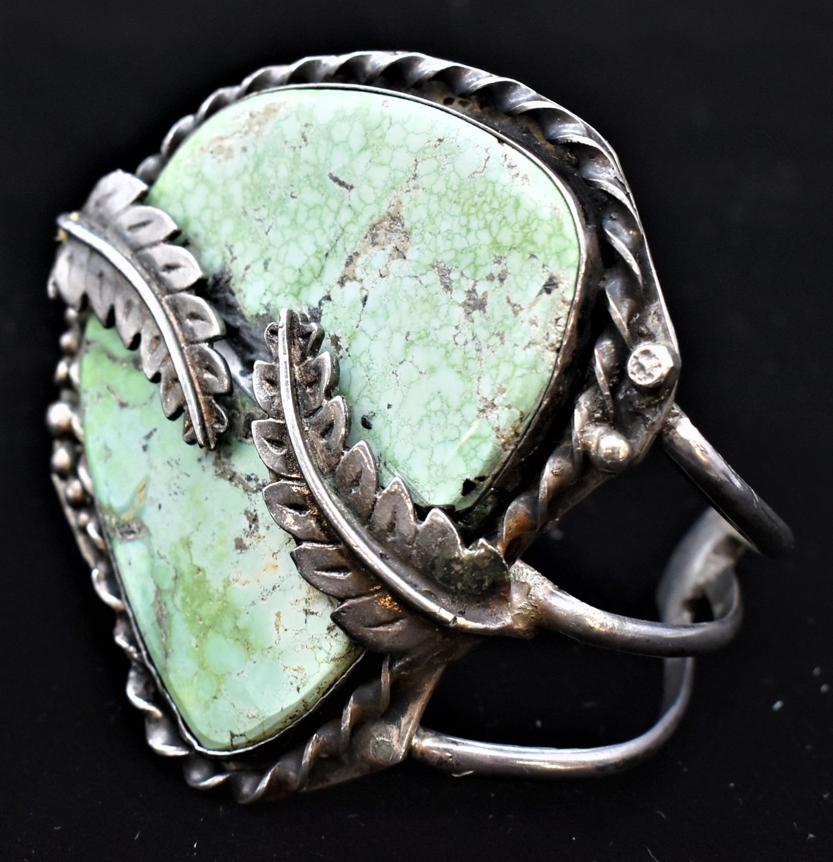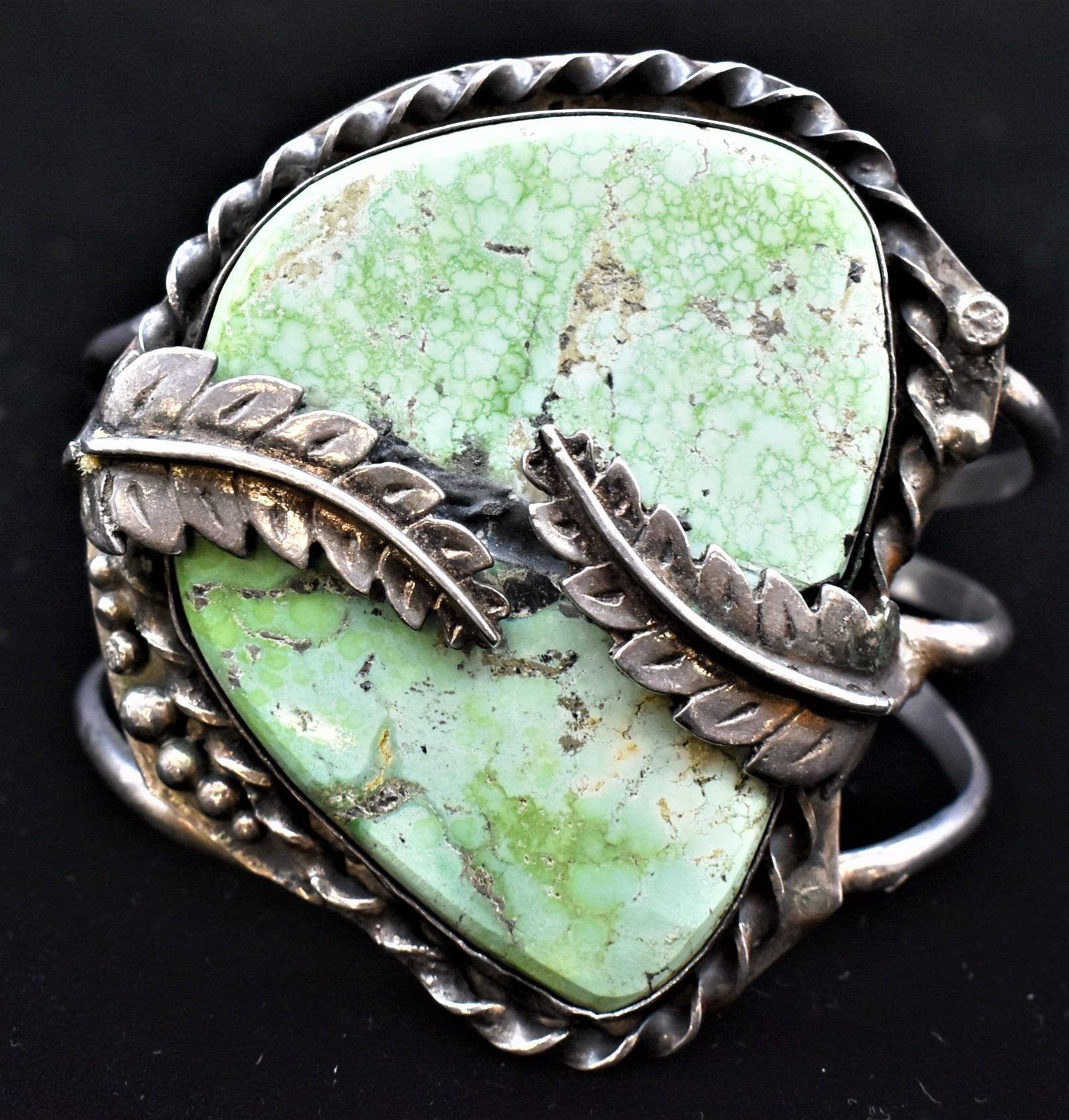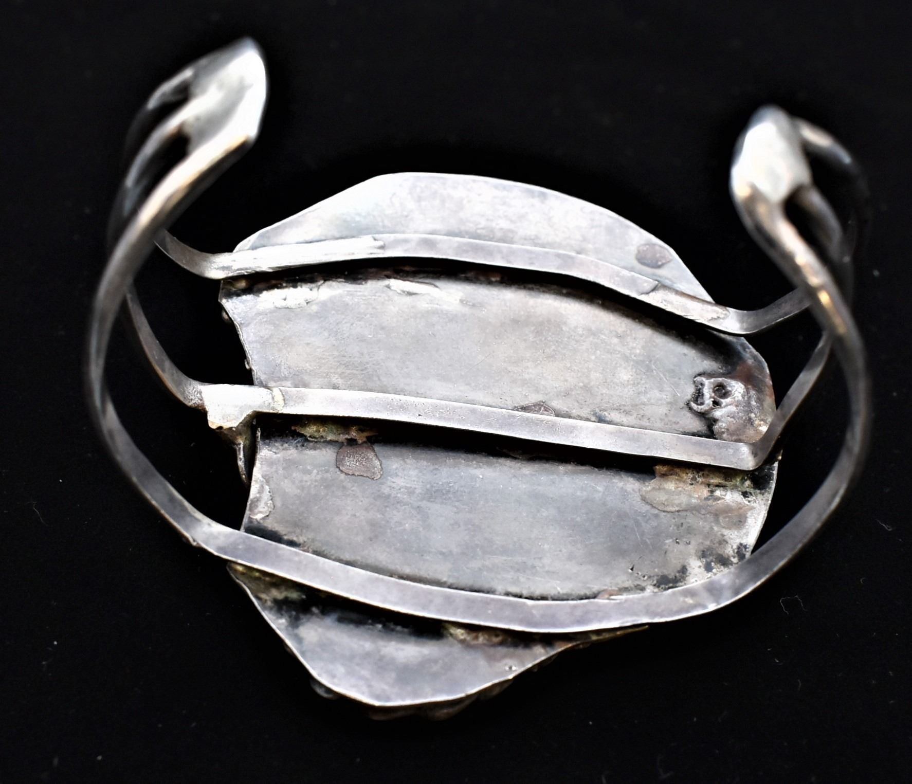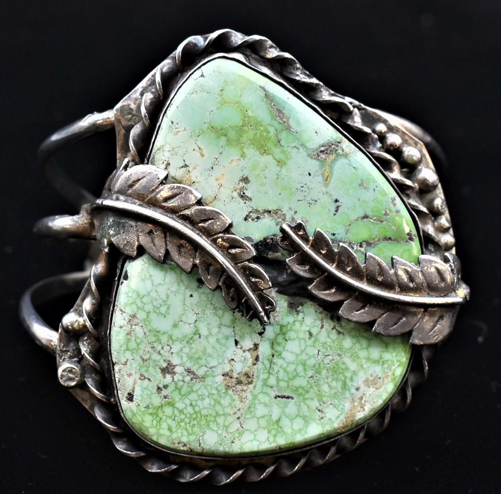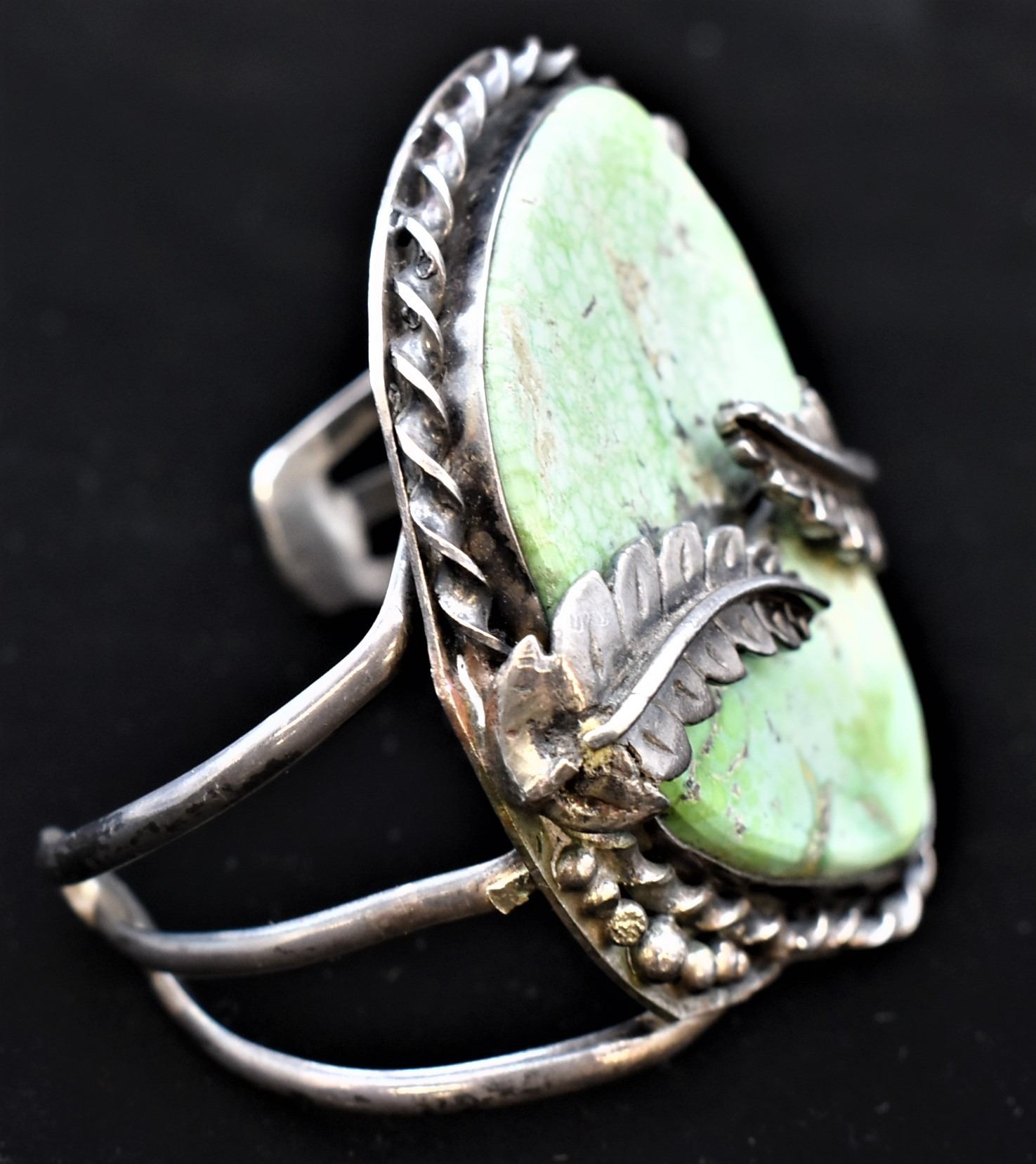 Historic Native American Navajo Sterling Turquoise Cuff Bracelet, triple shank, fabulous large turquoise cabochon, inside measures 8.25'' which includes the gap x 2.75''L x 2.25''W, total gram wt. of 93.7, looks like Carico Lake Turquoise, exquisite older piece