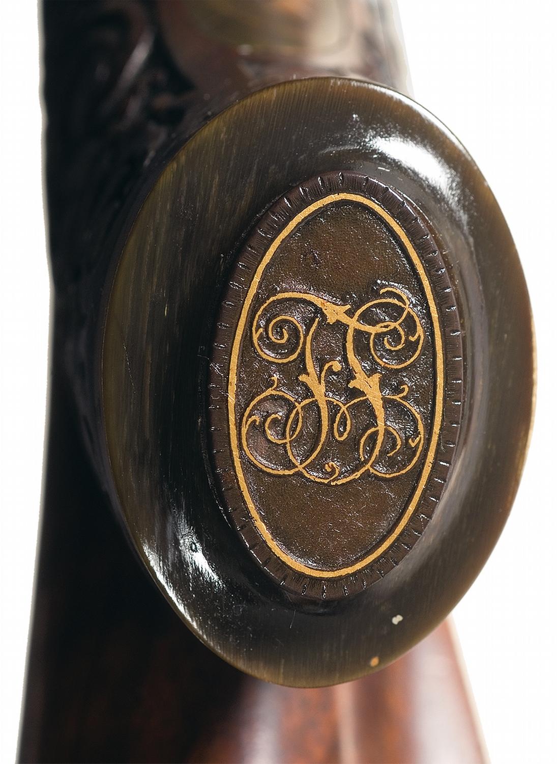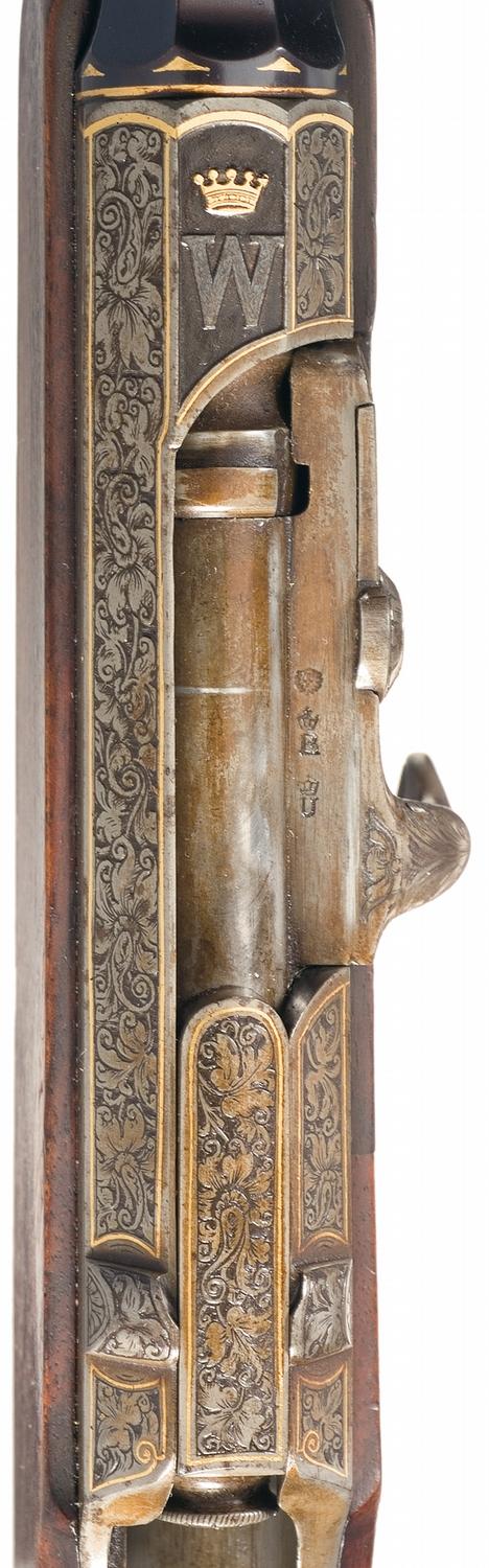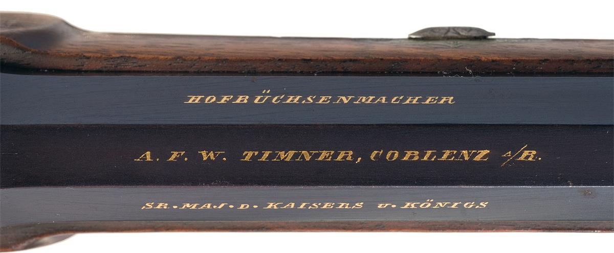 Late 19th Century German bolt-action, single shot rifle with the gold inlaid crown and relief carved "W" of Kaiser Wilhelm II engraved on the top of the receiver. The rifle has an octagonal receiver, bolt with turned-down, checkered, handle and bolt stop on the right side of the body. The bolt does not have a safety lever but otherwise resembles the bolt on the Mauser Model 71 Short Rifle. The wedge-fastened barrel is part octagon/part round with a seven-inch octagon section at the receiver and a two and one-half inch octagon section at the muzzle. A sling swivel is brazed to the underside of the barrel. The barrel has a fixed, dove-tail mounted, front sight and dove-tail mounted adjustable rear sight. The rifle is fitted with double-set triggers. The highly figured, European Walnut, high comb stock has a cheek-rest and horn forearm cap, trigger guard, pistol grip cap and buttplate. The barrel has a deep, commercial blue finish. The receiver and bolt are casehardened. The top barrel flat is inlaid with the maker's name: "A.F.W. TIMNER, COBLENZ A/R.". "SR. MAJ.D.KAISERS u.KONINGS" is inlaid in gold on the right barrel flat and "HOFBRUCHSENMACHER" is inlaid in gold on the right flat. Imperial German "Crown/B" and "Crown/U" proofmarks are stamped on the underside of the receiver. The underside of the barrel is numbered "433". The right side of the receiver is stamped with a small eagle and a "Crown/R" repair proof. The same eagle, "Crown/R", markings and the designation "7/6 MM" are stamped on the right barrel flat. The sides of the cocking piece, bolt body, top of the bolt handle and the receiver top, sides and tang are decorated with delicate floral engraving on a stippled background. The edges of the engraved panels are inlaid with gold borders. The gold inlaid borders extend to the barrel breech and muzzle. The stock is decorated with highly detailed relief carvings. The left side of the stock features a buck with a forest background. The pistol grip is covered with relief floral carving. There is a finely checkered panel with floral borders on the forearm. The pistol grip cap is carved with an elaborate, gold-washed, monogram. There is no history accompanying this rifle. It appears to be a handmade piece commissioned for Kaiser Wilhelm II. The Kaiser had a deformed arm and favored light, short-barreled, rifles like this example for hunting.