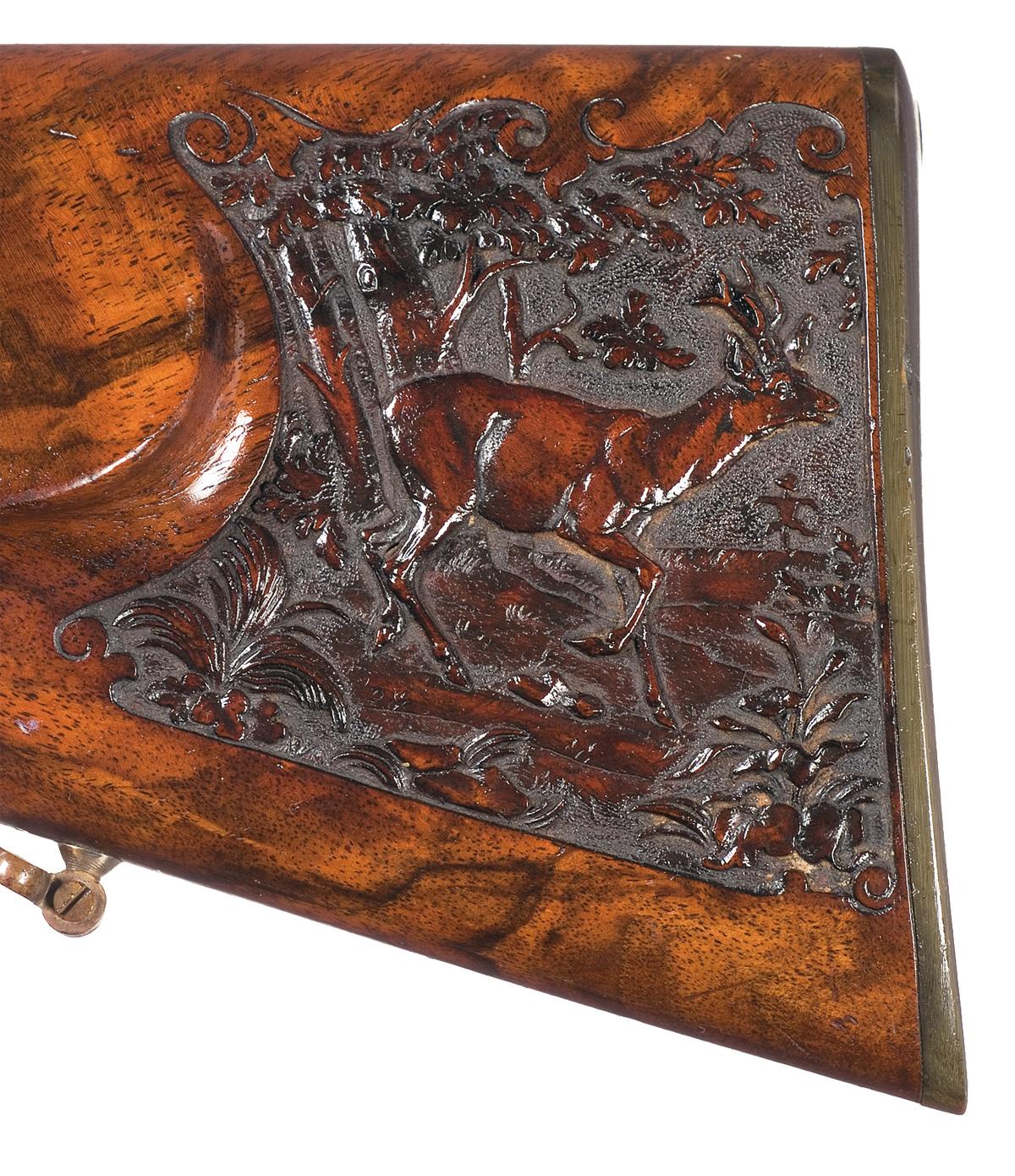 Condition: Very fine as period refurbished with 98% of the aforementioned blue remaining on barrel. The receiver 80% of the slightly faded original casecolors.The stock shows indications of well-executed period repair. There is a well-matched replacement insert on the right side of the stock below the bolt and repairs on the inside of the stock. Traces of the original checkering are visible at the rear edges of the stock flats. The relief carving on the forearm, pistol grip and left side of the stock behind the cheekpiece is crisp and in very fine condition. The balance of stock has minor handling marks on the forearm and cheekpiece but remains in fine overall condition. The detailed engraving on the bolt and receiver and is deep and sharp. The gold inlays on the receiver and barrel are intact. This rifle is an exceptional, historic, example of the finest 19th Century German craftsmanship.