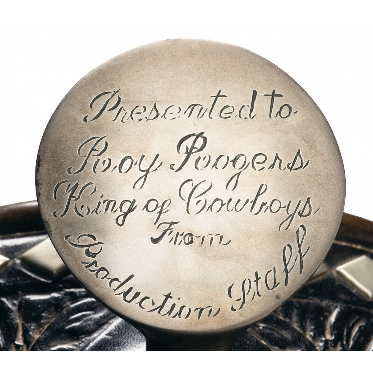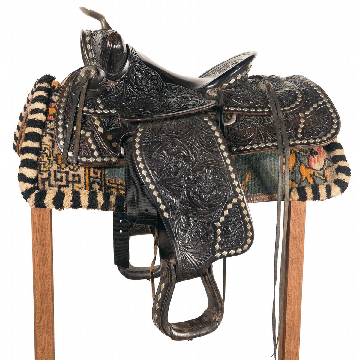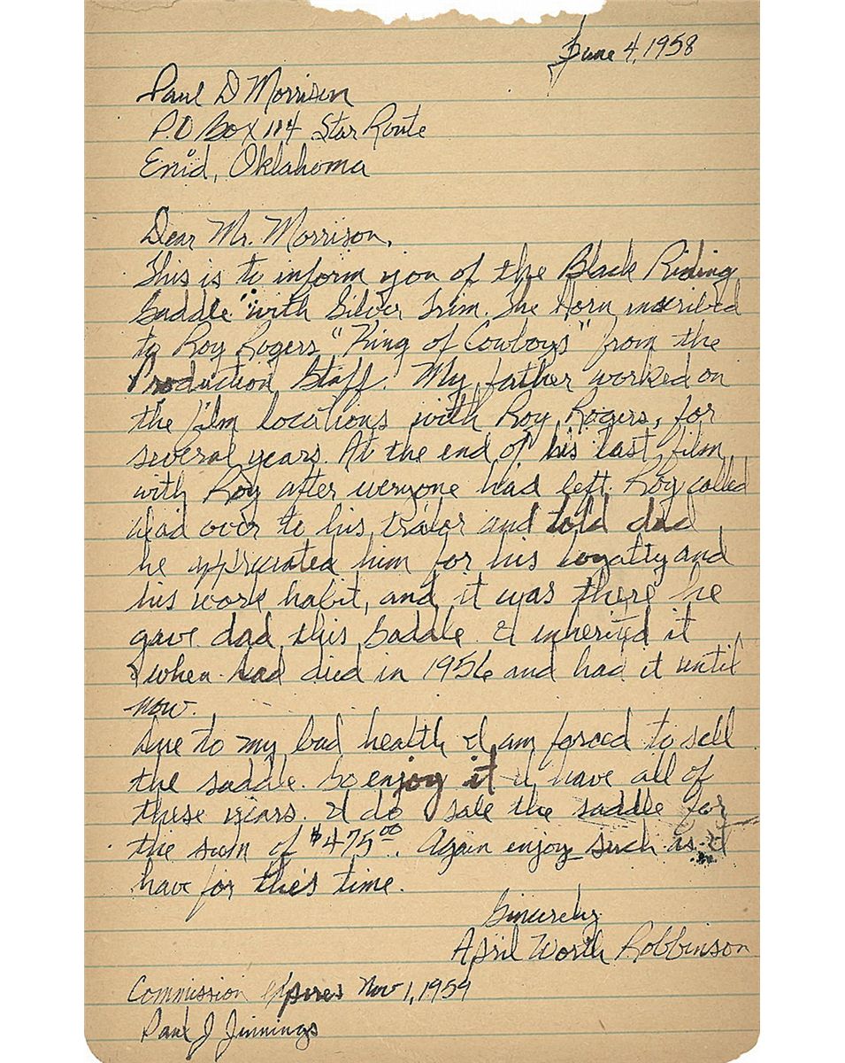 According to the included letter from April Worth Robbinson, this saddle was originally the property of Roy Rogers, who gave it as a present to Robbinson's father, a member of his production crew that was retiring, as a token of appreciation for his years of loyalty and hard work. Constructed from black dyed leather overall with extensive and deeply cut floral tooling and silver finished brass hardware and ornamentation, the saddle horn is inscribed "Presented to/Roy Rogers/King of Cowboys/From/Production Staff". Included with the saddle is a multi-colored corona style saddle blanket. Born Leonard Franklin Slye, Roy Rogers made his living as a country singer before getting his big break in Hollywood when Gene Autry briefly walked out on his film contract, creating a singing cowboy sized hole he was perfectly suited to fill. Later, he established Roy Rogers Productions as an in-house staff for the Roy Rogers Show as well as the Western program "Brave Eagle".