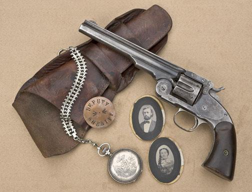 Historic Smith & Wesson Model No. 3 Schofield First Model single action revolver, .45 cal., 7” barrel, blue finish, wood grips, #2362. This gun is accompanied by an April 5, 1940 letter to Stanley Morton of LosAngeles, California from a Robert K. Kien of Van Nuys, California stating “On this day I Transfer to you the pistol I have obtain(ed) from the Wallace Olinger Estate. One Smith & Wesson Schofield model of the U.S. Army in45 caliber serial number 2362. This pistol was used by Wallace Olinger during the Lincoln County War. He was given the pistol by his wife Camellia who was married to W.H. Johnson who used the pistol until his deathat the hands of Hugh Beckwith in Augurst 17, 1878”. Additional summary information states the revolver was owned and used by W.H. Johnson, Deputy Sheriff, Lincoln County, New Mexico whileserving under William Brady; Johnson was killed on August 17, 1878 by his father-in-law Hugh Beckwith. His best friend, Wallace Olinger married his widow Camellia and carried the Schofield with it remaining