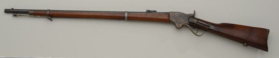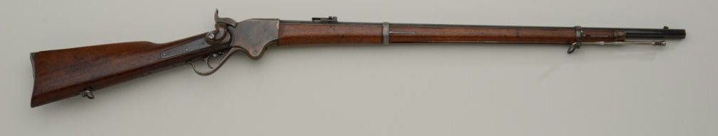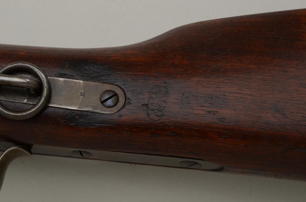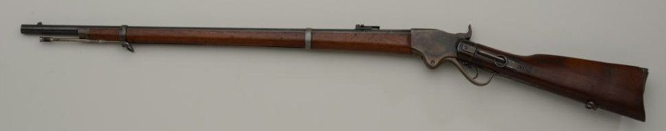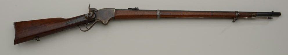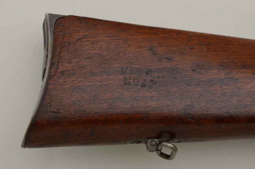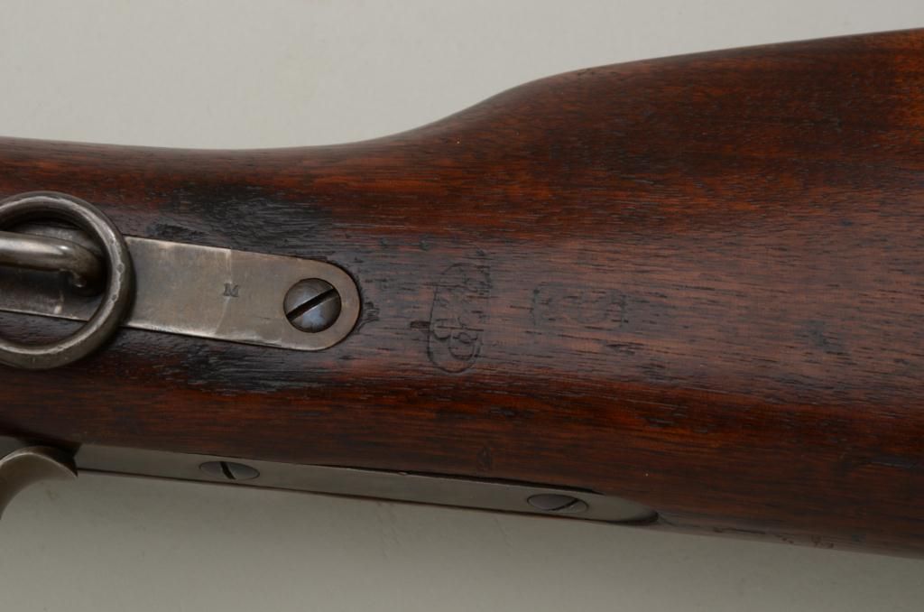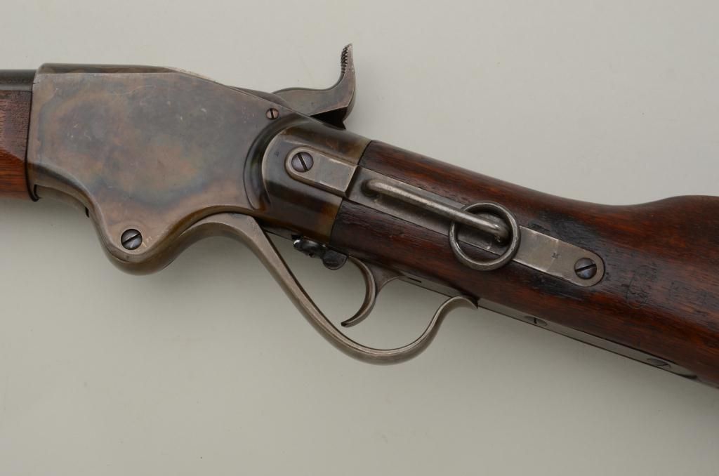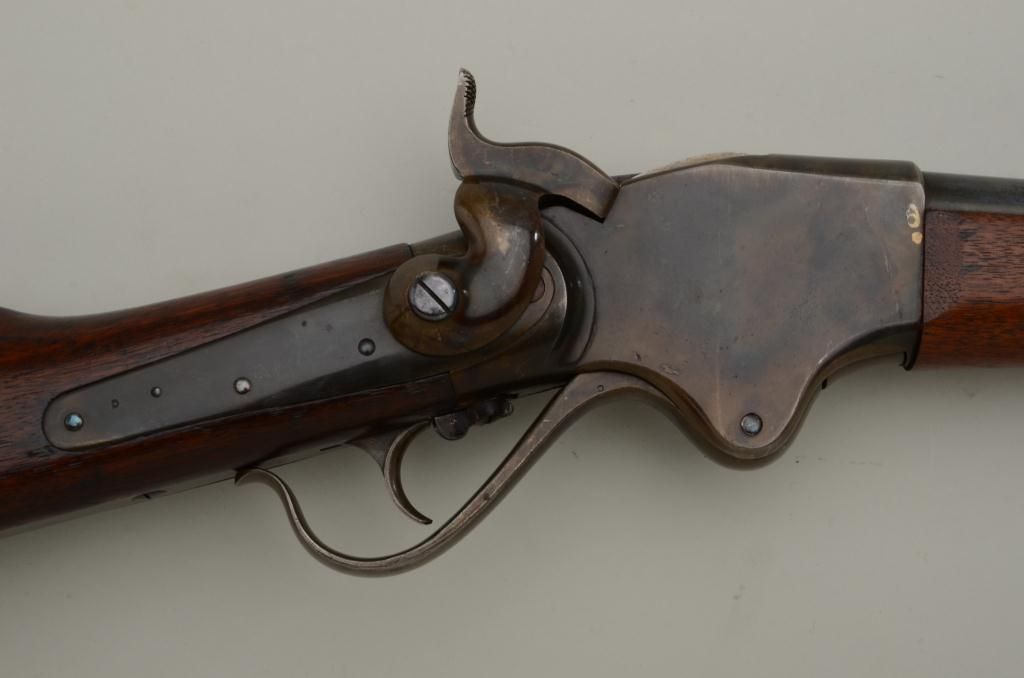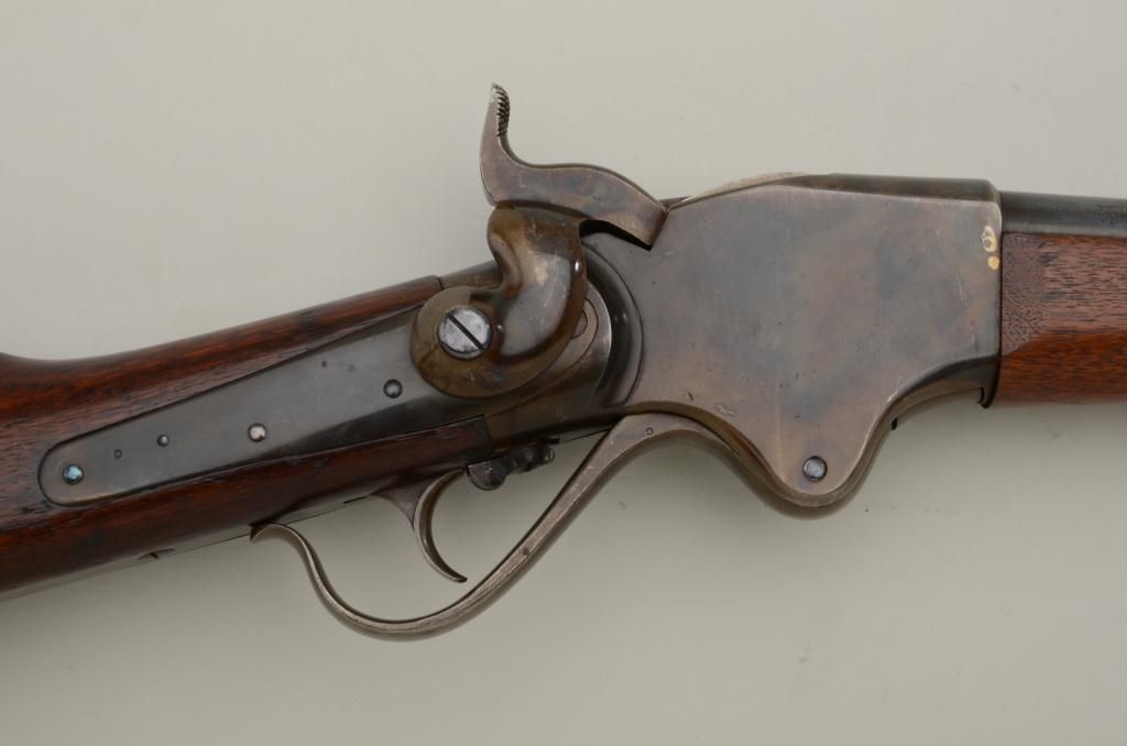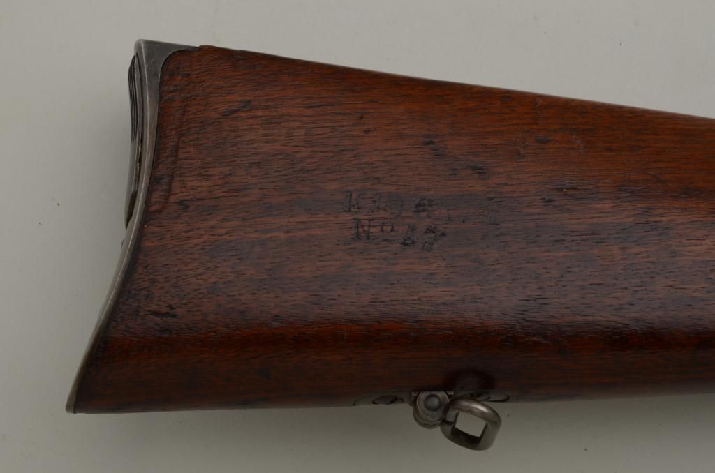 Historic Spencer Springfield Armory conversion rifle, .50 cal., 32-1/2” barrel, blue and case hardened finish, wood stocks with butt stock stamped on right side “K 10 CAV, No. 17”, #20915. This gun is in nearmint condition as Arsenal re-finished showing the majority of its blue finish on the barrel and fiery case colors on the receiver, hammer, lockplate, loading lever, buttplate and fore end cap; fine bore, crisp action,barrel numbered to receiver, stabler cut-off, wood stocks fine with inspector’s cartouche on left side of butt stock behind saddle ring bar assembly and some scattered old mars from storage; sling swivels, iron cleaningrod. A striking Spencer from the 10th Cavalry who were the famous Buffalo Soldiers who fought the Indian Wars of the Western Frontier. Est.: $5,000-$10,000.