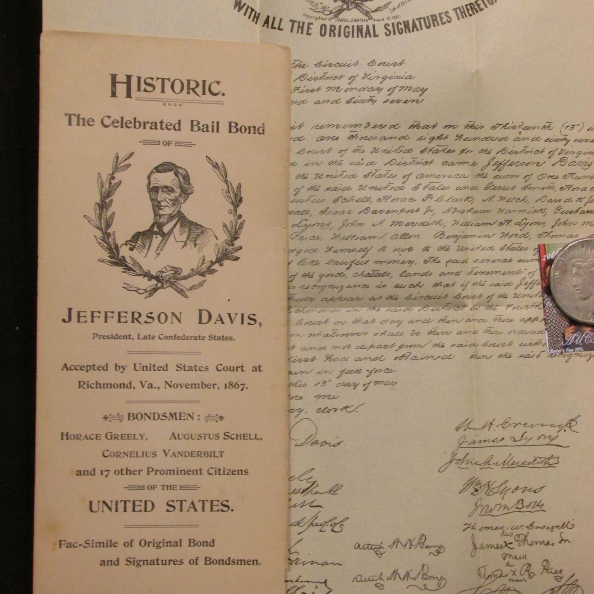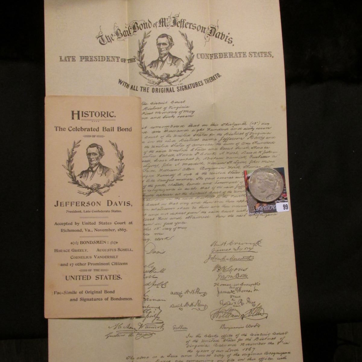 "Historic The Celebrated Bail Bond of Jefferson Davis, President, Late Confederate States. Accepted by United States Court at Richmond, Va., November, 1867…Fac-simile of Original Bond and Signatures of Bondsmen,"; & 1923 S U.S. Peace Silver Dollar, VF.