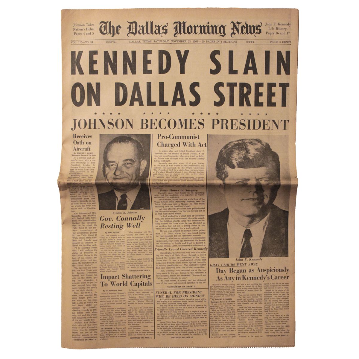 23 November 1963 issue of ''The Dallas Morning News'' from the day after JFK was assassinated in that city. Newspaper proclaims ''Kennedy Slain on Dallas Street''. Articles and photos throughout the 48pp. paper include iconic photo of Johnson taking the oath of office on Air Force One and news of suspected assassin Lee Harvey Oswald. Moderate toning to newspaper, measuring 15'' x 23'', else very good condition.