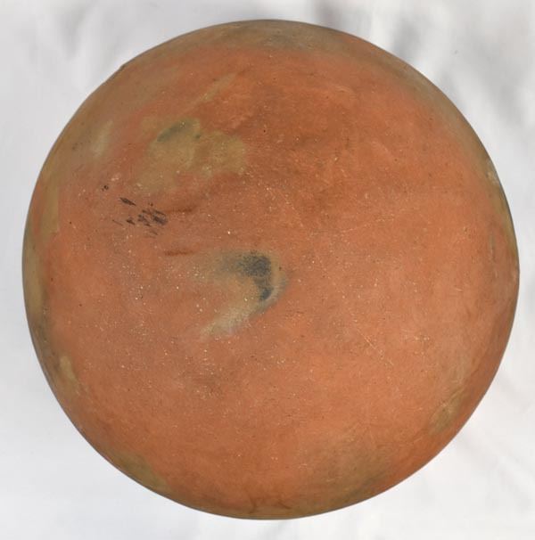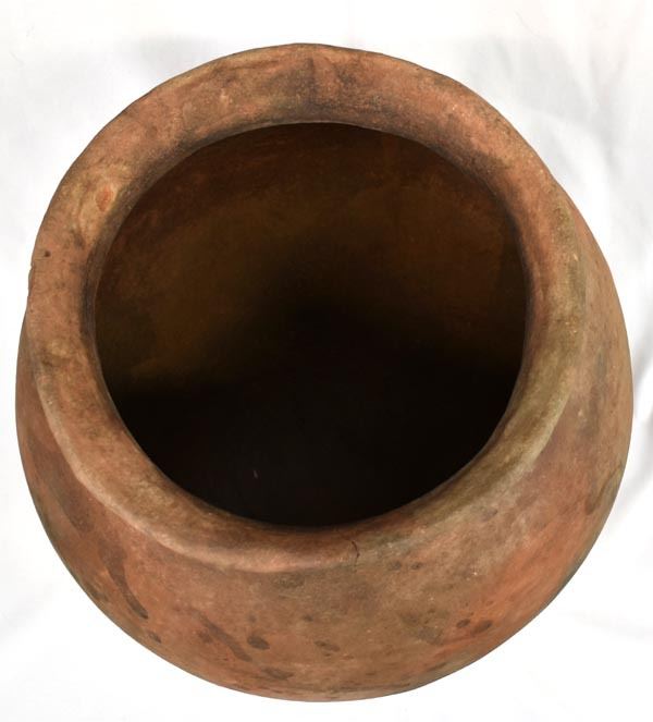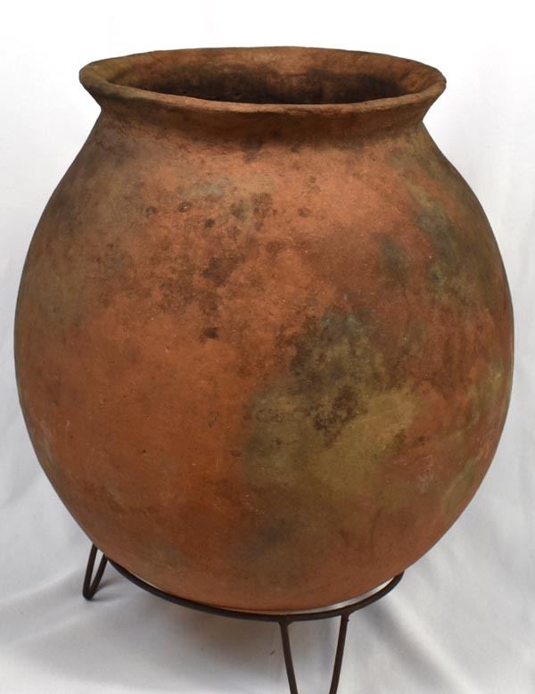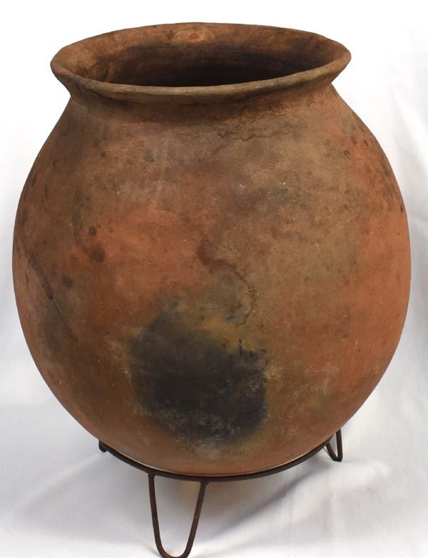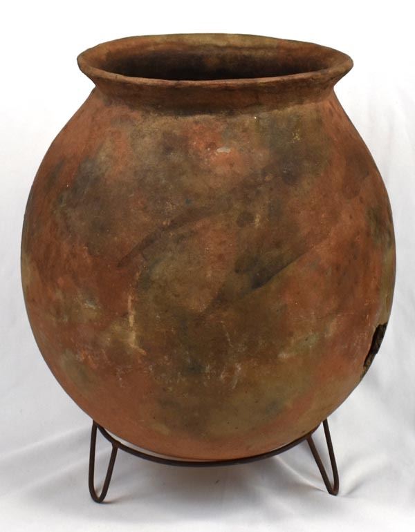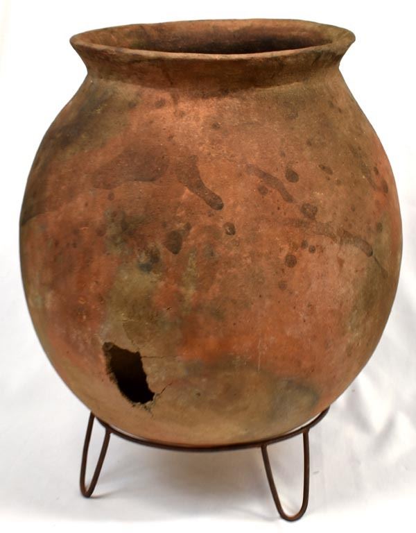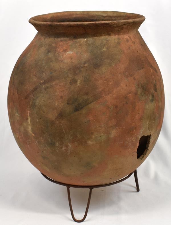 Historic Native American Tohono O'odham Pottery Olla, measures 17'' x 18'' with a 10''D opening, there is a hole on the side measuring approximately 3''L x 1.5''W, comes with metal pot stand