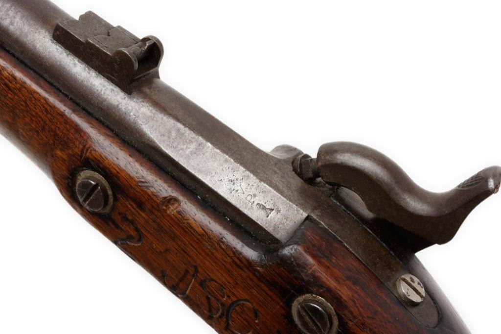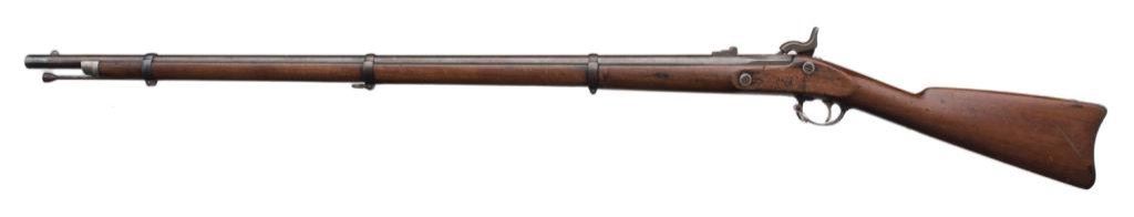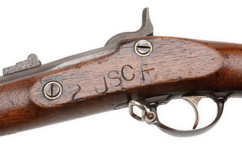 Historic U.S. Springfield Model 1863 percussion rifle, .58 caliber, 39.5” barrel, full length wood stock, three barrel bands, sling swivels, iron ramrod, left side of stock by breech stamped “2 USCT”. This rifle was previously in the Col. William Orbelo collection with copies of documents related to its display at the Story of Texas exhibit in the Bob Bullock Texas State History Museum from 2009 to 2011. Accompanying the gun is also a CDV of a man in a suit with hand inked inscription: “GREAT GRANDFATHER HWC MUSKET TAKEN FROM NEGRO YANKEE 1865 AT PAMETTO RANCH, TEX”. Also included is a copy of p. 327 of the “Hand Book of Texas, Vol. II” which describes the Battle of Palmito (sp) Ranch on May 11, 1865, where black troops under the command of Lt. Col. David Branon were sent to take possession of Brownsville, TX after the surrender of Generals Robert E. Lee’s and Joseph E. Johnston’s forces . The Confederates in the area had not been notified of the surrender and attacked the Union forces, driving them from the field of battle. The Confederates learned of the