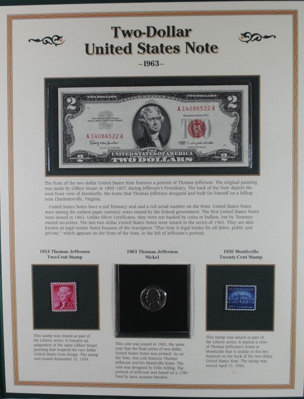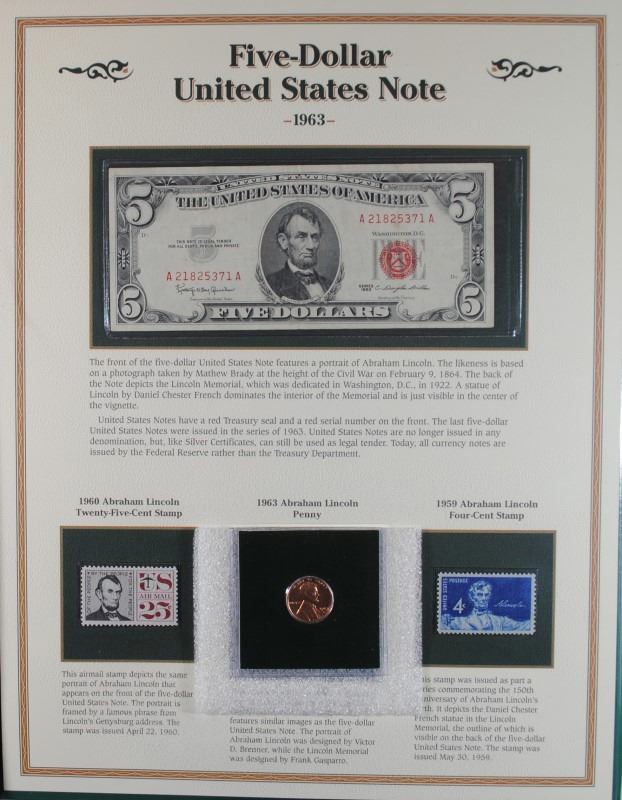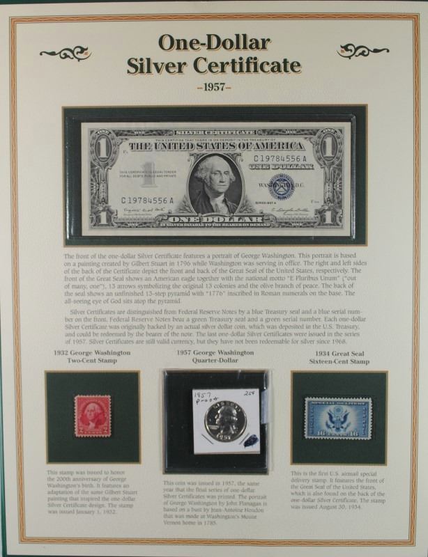 Seal - With 1957 Proof Washington Qtr, 1963 Unc Nickel, 1963 Unc Lincoln Cent and 6 - Historic Stamps in Nice Display Album, ESTIMATE $30-$50