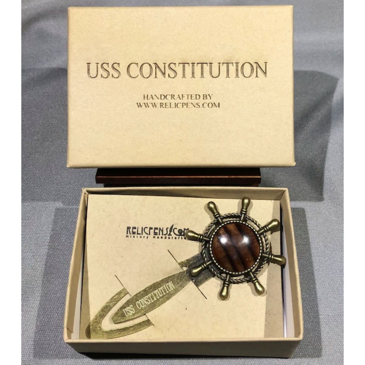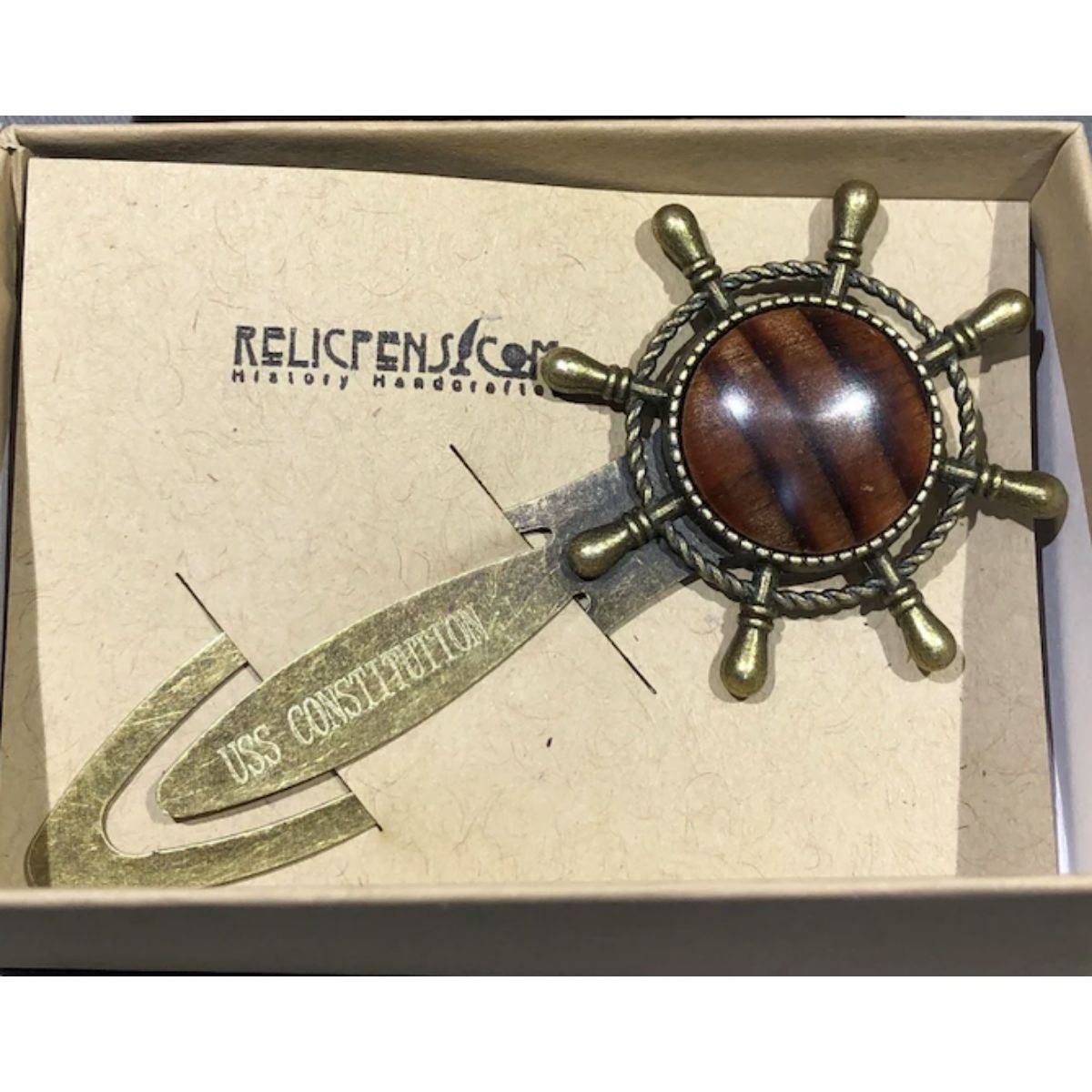 Ship's Wheel form bookmark, made from Fir End Grain removed off of the USS Constitution. Grain and color of oak may vary. Antiqued brass fittings. Comes with a signed COA and the pictured gift box. Â