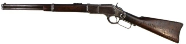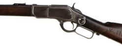 from the early Turkey Track Ranch in Arizona, includes letter from the consignor who purchased the gun from a family member over 20 yrs ago, letter states the carbine was carried by a Turkey Track cowboy on trail drive to Big Timber and Lewistown MT area on two seperate drives, the cowboy and his gun staying in Montana after the last drive. Left side stock shows Turkey Track brand next to 6 unknown kill marks. Good overall condition third model with dust cover removed, cleaning rod in butt stock present, metal surfaces silver gray drifting drown, original saddle ring shows moderate wear into receiver. Walnut stocks with moderate dings and dents as expected from a true cowboy gun that's seen many trail miles. Mechanically sound with good firm action and good bore. Antique. Mfg'd 1885. Est. 2500-3800