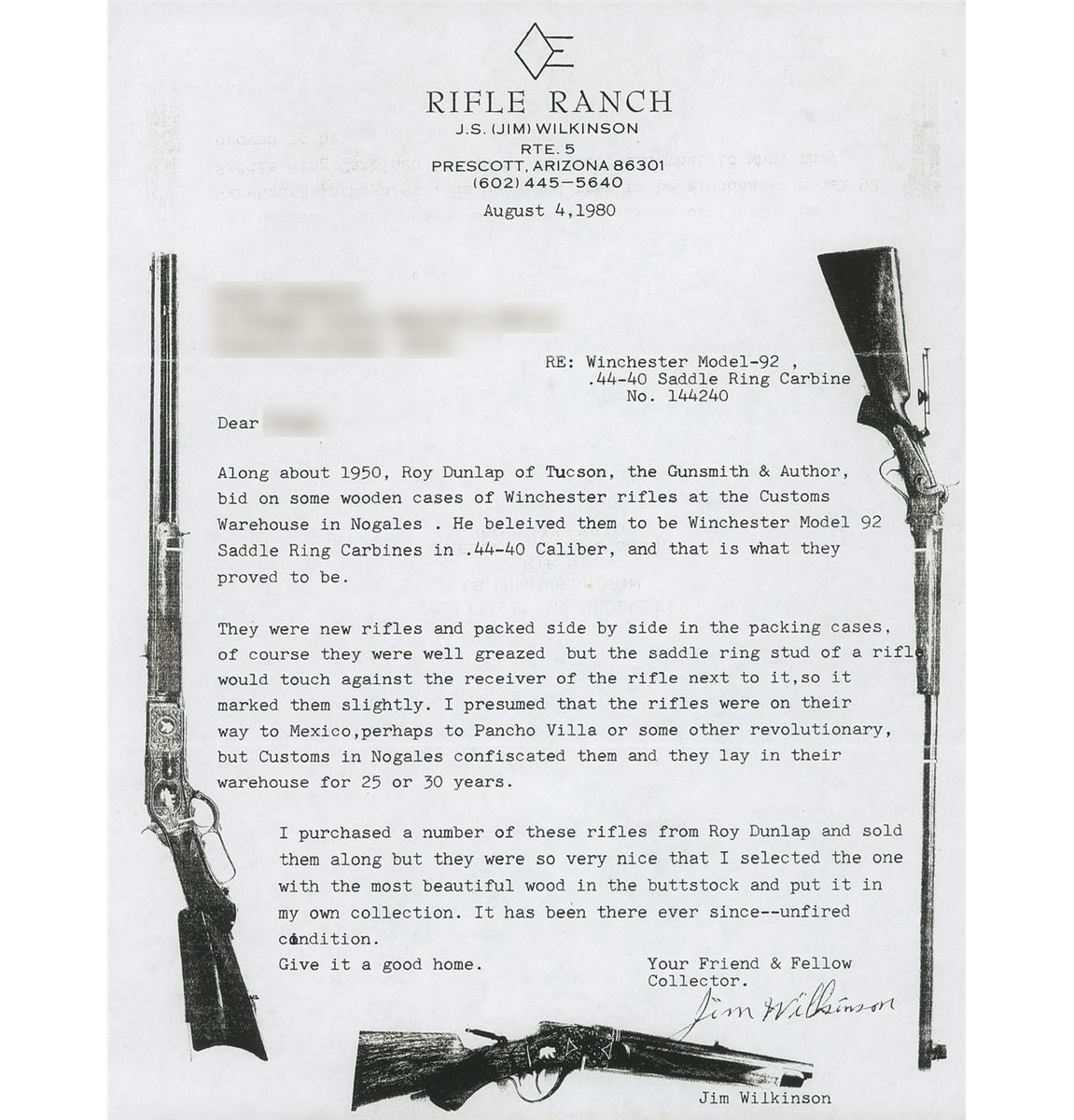 Winchester Model 1892 carbine manufactured in 1896. A 1980 dated letter from J.S. Wilkinson of Prescott, Arizona, that accompanies the carbine states that this carbine was from a group of several cases of "Winchester rifles" purchased from the U.S. Customs Service at Nogales, Arizona, c. 1950 by author Roy Dunlap. The carbines had apparently been seized by the Customs Service "25 or 30 years" before they were purchased by Dunlap. The author of the letter states that the "rifles" were new in the original packing cases and that he purchased several of the "rifles" but retained this carbine in "unfired" condition. The letter states that Wilkinson "presumes that the rifles were on their way to Mexico, perhaps to Pancho Villa or some other revolutionary" when they were seized by U.S. Customs. The carbine has a blued barrel, magazine, barrel bands, receiver and buttplate. The hammer and lever have a case-hardened finish. The stock and forearm are straight grain American walnut with a varnish finish. The carbine has a block front sight located behind the upper barrel band and a folding leaf rear sight graduated to 900 yards. A staple-mounted saddle-ring is located on the left side of the receiver. The upper tang is factory drilled and tapped for a rear sight. The top of the barrel is roll-stamped: "MANUFACTURED BY THE/-WINCHESTER REPEATING ARMS CO. NEW HAVEN. CONN. U.S.A.-" in two lines ahead of the rear sight. "44 W.F.C." is roll-stamped between the rear sight and the receiver. The upper receiver tang is roll-stamped: "MODEL 1892./ -WINCHESTER-/ PAT. OCT 14. 1884" in three lines. The serial number, "144967" is roll-stamped across the front edge of the receiver bottom.