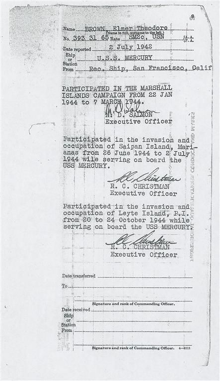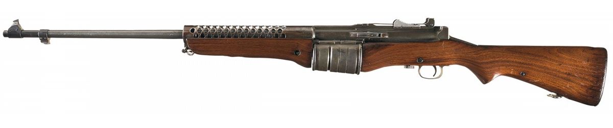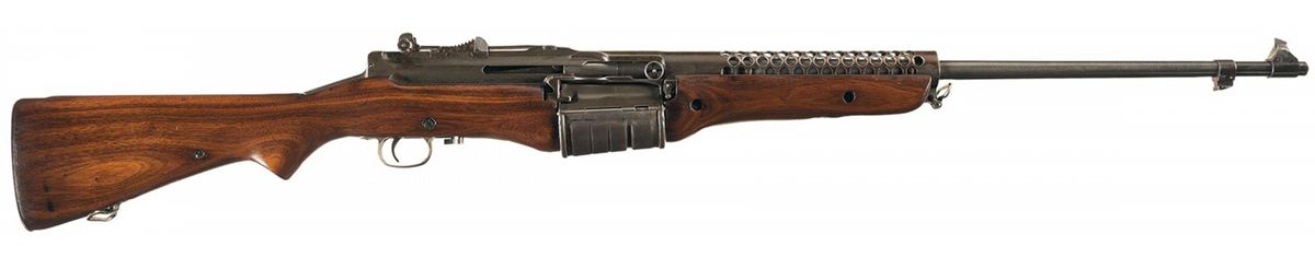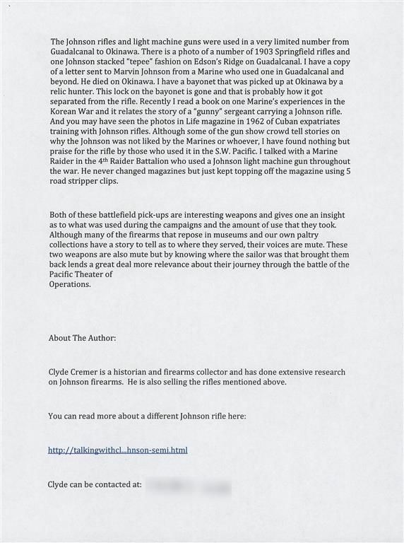 This is a historic example of a very scarce early WWII Johnson Semi-Automatic rifle as designed by Melvin Johnson. This rifle along with an M1 Garand Rifle (see below) was a late WWII battlefield pickup. The serial number of this rifle "9812" place manufacture of these rifles in early 1940/41 time frame. Both of these rifles were picked up by a sailor from the USS Mercury (AK-42) which was a transport and resupply ship that was launched in July 1939 that served her entire duty in the Pacific Theater. The associated documentation identifies the original owner (sailor) as Elmer Theodore Brown, who was originally posted to the USS Lexington in Jan 1940 and served on her until she was sunk during the battle of Coral Sea, May 1942. At that time he was transferred to the USS Mercury and served on her through the end of the war. During this time he participated in the following landing reinforcements: Guadalcanal Dec 1942, the Marshall Island Campaign June-July 1944, the invasion of Leyte Island P.I. October 1944, and the invasion of Lingayen Gulf, Luzon Jan 1945, and finally as a support member of the Task Force 58 during the invasion of Okinawa March-May 1945. Somewhere in one of these campaigns is where he picked up this rifle when evacuating casualties from the battle field. The receiver is marked with the standard five line patent dates followed by the four line "JOHNSON AUTOMATICS/MODEL OF 1941" logo, address and the serial number "9812". The center barrel support flange is marked "30-06" and "41" for the year of manufacture with the breech end of the barrel marked "30-06" and "45-506" with a small "41 stamped on the barrel lug. The guards on either side of the front sight blade has been ground down to the base, which has been noted in some literature as being the style preferred by the Marines. The right rear side of the receiver is stamped with a small five-pointed star over an inverted triangle with "CRANSTON/ARMS/CO." inside. The right side of the rear sight is stamped "METERS" with "M2" stamped on the left side. Oil finished two-piece walnut stock with a checkered steel buttplate. In the documentation that accompanies this fabulous rifle the consignor has stated that this rifle was passed from the original Navy veteran to his brother and then on to his nephew, consequently this rifle has remained in the same family since being liberated during WWII that's 68 years in the same family! What providence!