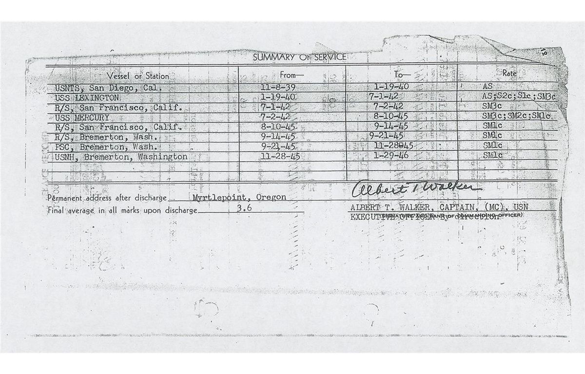 Fine with 60% of the original parkerized finish overall mixed with an aged gray patina (most likely caused by tropical climate). The markings are clear and distinct. The stock and forend have an old light sanding that has been roiled/lightly revarnish with extensive handling marks. This rifle is missing the bolt catch, so it won't remain open after the last round is fired. This fine old rifle is accompanied by a written documentation of the original sailor's war history, along with some of his service records and pictures of the USS Mercury.