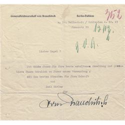 (1881 - 1948) German Commander in Chief of the Wermacht from 1938 to 1941 when Hitler personally assumed the post. Partly-printed war-date D.S., 1p. f
