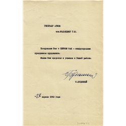 (1913 - 1985) Russian World War II ace, a three-time hero, and one of the first to fly a MiG-9.Unusual typed D.S. 4pp. 4to., Sept. 22, 1965, in Cyrill