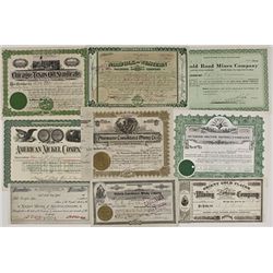 A lot of nine attractive stock certificates from1887-1920, issuing shares in: the Victoria Consolidated Mining Company, Orient Gold Placer, Chicago-Te