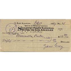 (1875 - 1939) American author of tales of the American West, including Riders of the Purple Sage. D.S. "Zane Grey", a check, 2 3/4" x...