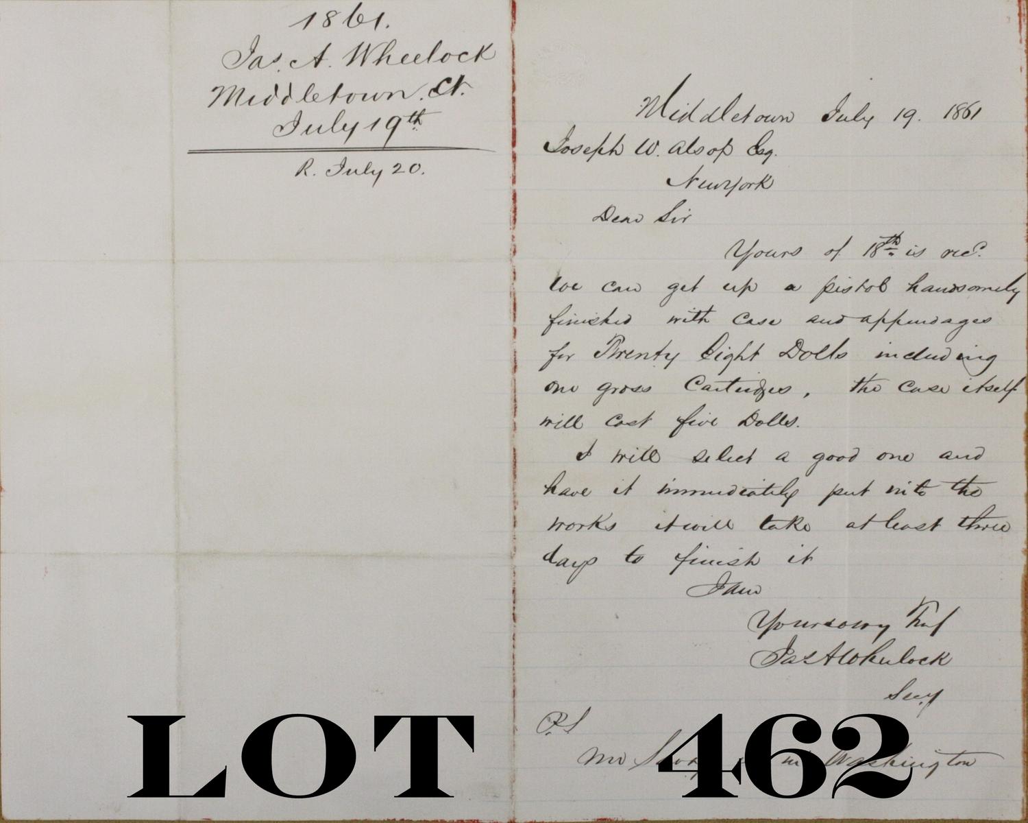 Historic original letter dated July 19, 1861 from James A. Wheelock to Joseph W. Alsop concerning the shipment of a cased pistol. The letter is in overall very good condition and is from one gun manufacturer to another. Est.: $150-$300.