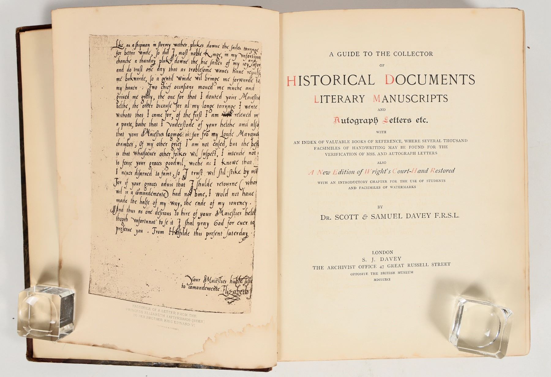 A copy of 'A Guide to the Collector of Historical Documents, Literary Manuscripts, and Autograph Letters, etc.', by Dr. Scott Davey and Samuel Davey. Published 1891. Rare. The Guide contains "an index of valuable books of reference, where several thousand facsimiles of handwriting may be found for the verification of MSS. and autograph letters". The book contains hundreds of pages of reference material such as indexes and reproductions of famous figure's handwriting, as well as discussion of topics such as valuing documents and identifying forgeries. Original leather and marbled paper binding with gilt decoration on cover. Some cosmetic damage to cover, rounded corners, otherwise in great condition for its age. 8"x10.25"x2".