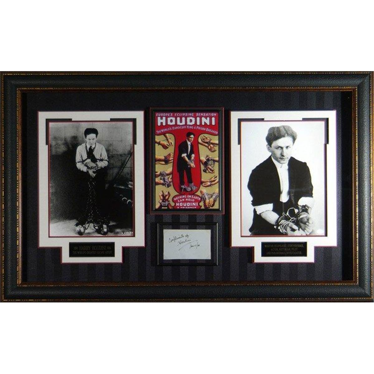 Historical: HARRY HOUDINI: Harry Houdini signed collage. Replica keys and images of the 1899 escape. Houdini signed a small card that reads Best Wishes Houdini, My brain is the key that sets me free.