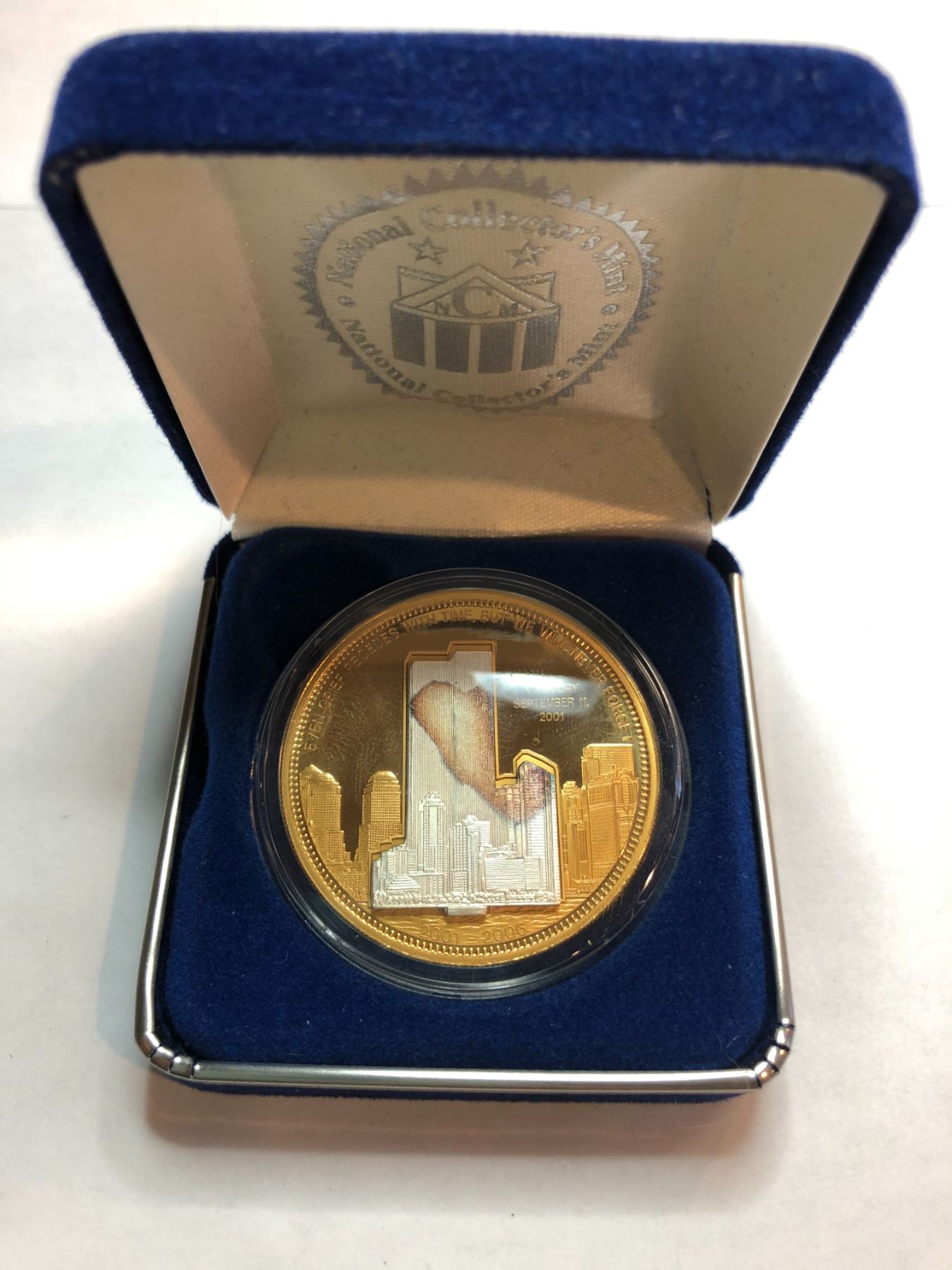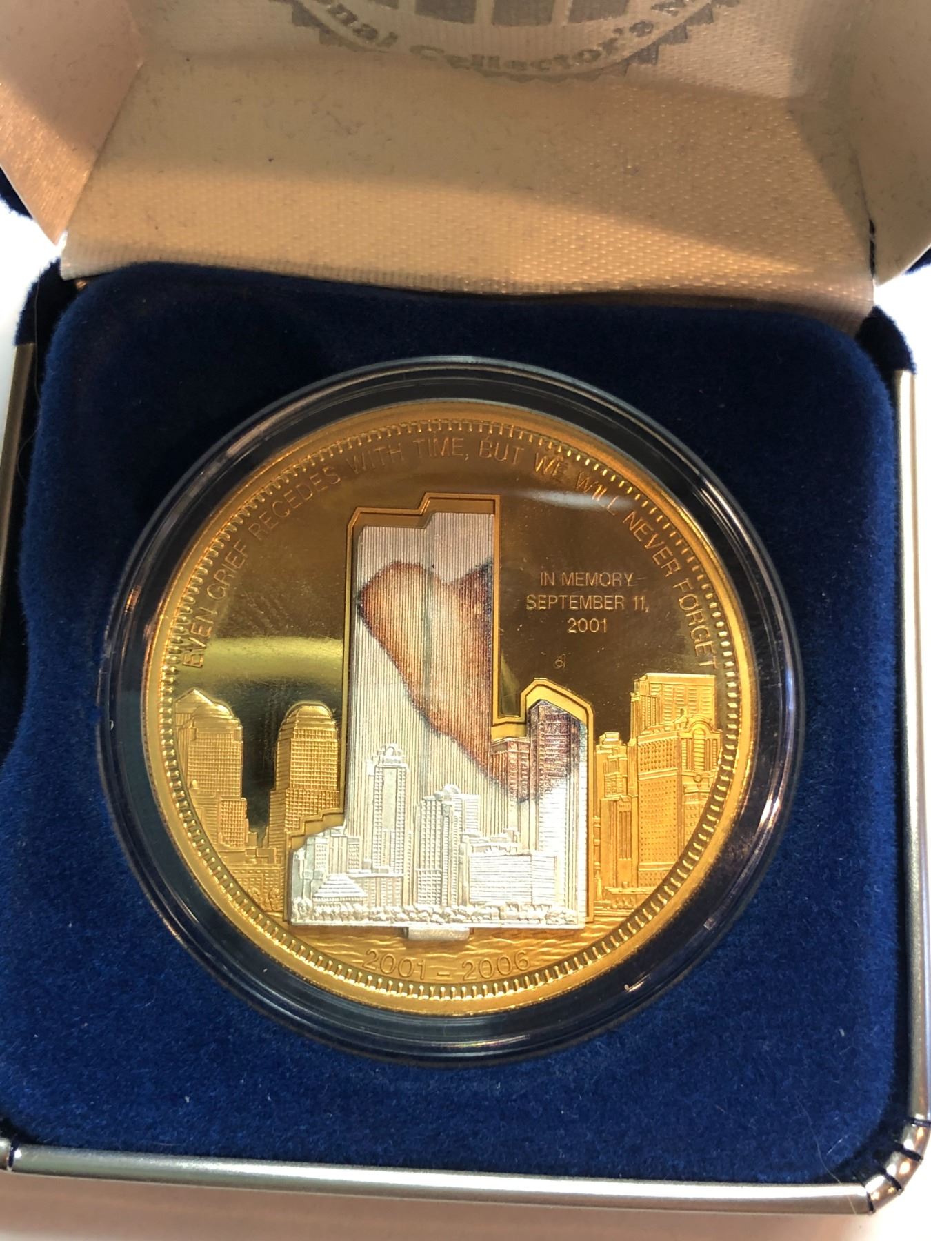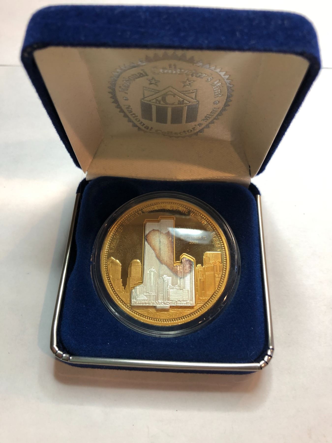 This truly unique commemorative is created using two distinct struck pieces. First, a traditional round planchet is struck with frosted relief on a mirror-like background. Then, a magnificently engraved skyline featuring the Twin Towers is struck separately and fitted into the background. This World Trade Center skyline can be removed and inserted into a slot on the face of the commemorative. The effect is dazzling -- it is literally transformed into a standing sculpture of the Twin Towers! The World Trade Center skyline is lavishly clad in gleaming silver that was miraculously recovered from a bank vault found under tons of debris at Ground Zero. Now, to mark the fifth anniversary, the same silver that was reclaimed from the destruction has been used to cover the magnificent Twin Towers depicted in the 2001-2006 World Trade Center Commemorative. The stunning design of this magnificent September 11th memorial is a 15 mg. of 24 KT gold and 15 mg. of .999 pure silver clad tribute to all who were lost on that fateful day. $5 of every commemorative order is donated to official 9/11 family charities and memorials