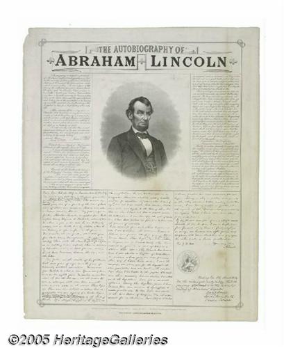 <B>Historical Poster Advertising the Autobiography of Abraham Lincoln</B></I> Published in 1872 by James R. Osgood and Co. of Boston, picturing a beautifully done litho of Lincoln in the center with facsimiles of his handwritten biographical notes. The 21.25" x 27" poster is in very good condition with only a few minor edge problems and one very fine tear in the center at the top. Easily framed and matted, it would present nearly mint and command importance on any wall on which it was hung. s Lot:258