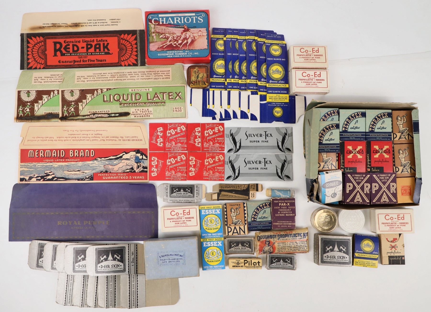 A masterful collection of historical prophylactics and prophylactic boxes. Perhaps 100 pieces overall. A sample of brands: tetratex; Chariots (Goodyear); Sheik; Deer Skin; Essex; Three Knights (Goodyear); Co-Ed; Smithies; Silver-Tex; and more. This is quite the historical collection!