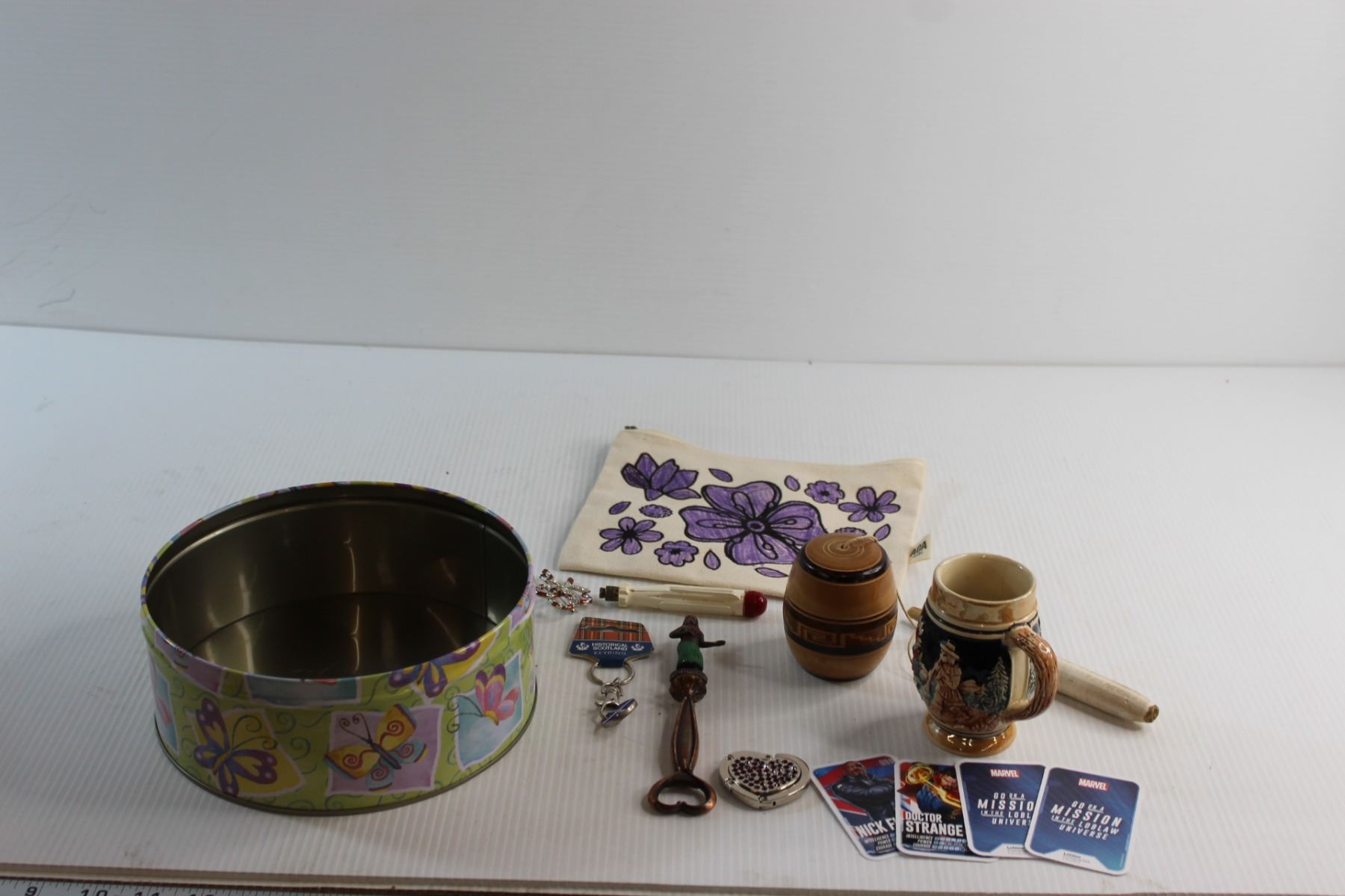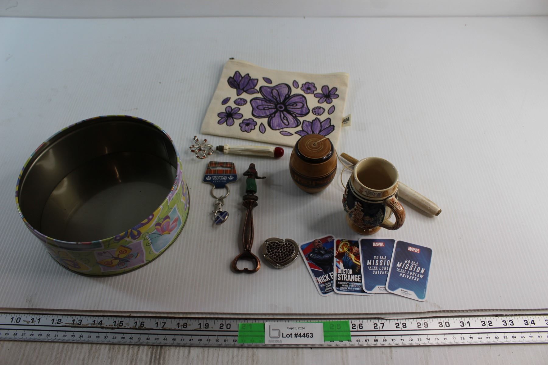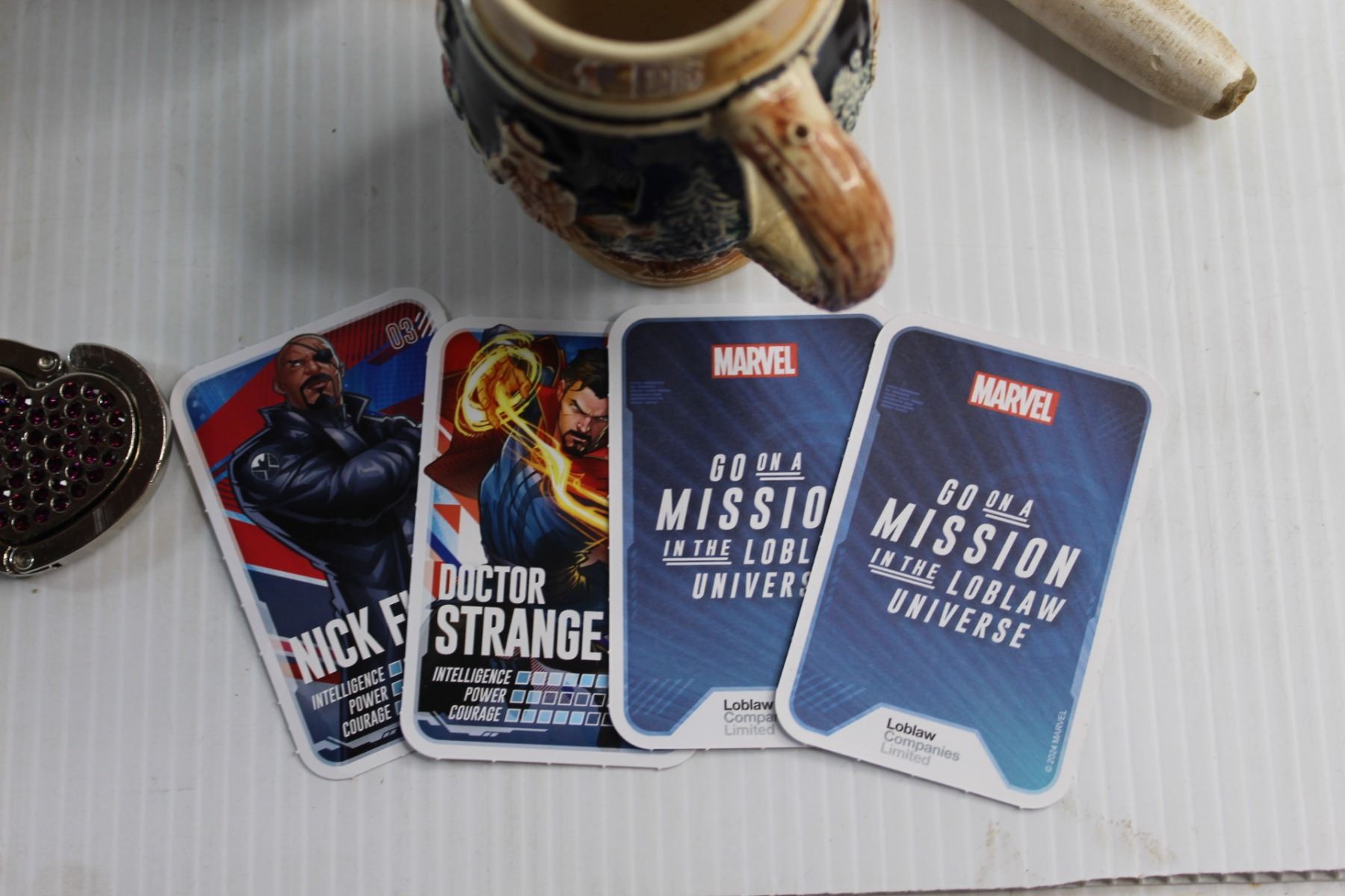 Historical Scotland Keyring, Decorative Mug, Assorted Marvel Cards and Assorted Items