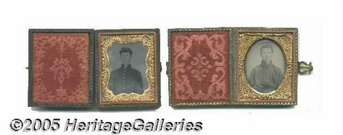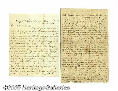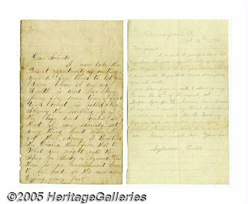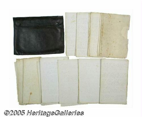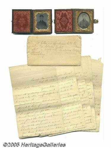 <B>Historically Significant Civil War Diary From Andersonville Prison</B></I> This is absolutely one of the most interesting and moving Civil War diaries that you will find. This lot consists of the over 100-page handwritten Civil War diary of Sgt. Sylvester Porter, member of Company L, 4th Pennsylvania Cavalry, as well as letters and two ferrotypes. Porter's diary begins on June 27, 1862 with the Battle of Gaines Hill and concludes on August 23, 1864, the day after his death at the infamous Andersonville Prison. A fellow prisoner took over the diary after Porter was too ill to continue it. Included with the diary is an annotated typewritten transcription, making it very easy to read and study. We feel that it would honor Sgt. Porter's memory to pull some quotes from this landmark journal, starting with his capture. <I>"Monday Oct. 12th (1863): Crossed the Rappahanock went into Camp. Pitched our tents. Remained there for a few hours, when we were ordered back to Jefferson. Took possesion of the town and held it until about 4 P.M. when we were ordered to fall back. The enemy by this time had thrown a force in our rear and cut us off from the River. We resisted them for a long time, but as there was only the two (2) Regiments of us we were overpowered by--Ewells Corps., when all that were dismounted were taken prisoners. The mounted men cut their way out. We were then marched back to the rear, and put under Guard we suffered a good deal from Cold as all of our Blankets and Coats were on our Saddles. Thursday Oct 15th: Left Gordonsville a little before daylight for Richmond. The Road was pretty bad and the cars ran pretty slow. We arrived at Richmond about 3 P.M. when we were marched to a Tobacco house and there put away for safe keeping."</B></I> (This "Tobacco house" is Libby Prison.) "<I>Tuesday Nov 3rd: Some of the boys cut the Buttons off their clothes, and sells them for Bread. Pretty hard times in Rebeldom. Friday Jany 15th (1864): The Sun has now disappeared behind the Tree Tops and I am still a Prisoner of War But we ought to be content in our position in life, allways Pray and never faint. I read the 1st and 2d Chapter of St. John today. Friday March 11th: ...Arrive at Henderson "Ga" about 12 O'Clock at night. Where we are put into a field containing some 6 or 8 Acres with a fence some 12 feet high Hewed Logs set on their ends in the ground. Passed through large swamps."</B></I> (This is Andersonville Prison.) <I>"Tuesday June 14th: Rain nearly all day and Cool. A great many of the men are compelled to Lye out in the rain and mud without Blankets or anything else to Shelter them. Tuesday June 21st: ...More Prisoners arrived. A Great many dead laid at the Dead House in the morning They Haul them off as if they were logs of Wood. Monday July 11th: ...Six of our men were hung today inside the Camp. I saw them all hang at one time. The Charge preferred against them was for murdering some of our own men in camp. Saturday July 16th:"</B></I> (Written by John Hughes.) <I>"Thomas Brandon and myself carried Sylvester to the Doctors and back. The weather was so warm that he fainted on the way. Sylvester gave us Permission to keep his book for him until he gets well. Tuesday Augst 23d: To Day I examined the Sick List and found Sylvester's name on the Dead List. He died on the 22d of this month. The Day is warm and Pleasant."</B></I> (This is the last entry.) An incredible collection containing many names, dates, battles and comments. Worthy of research and even publication. One of the 1/9th plate cased tintypes included is of "Uncle" Sylvester Porter, the other of "Grandpa Berger," another Civil War soldier. The diary pages are on lined journal paper and in generally fine condition with some expected roughness and soiling. A vintage leather document pouch is also included. Lot:251