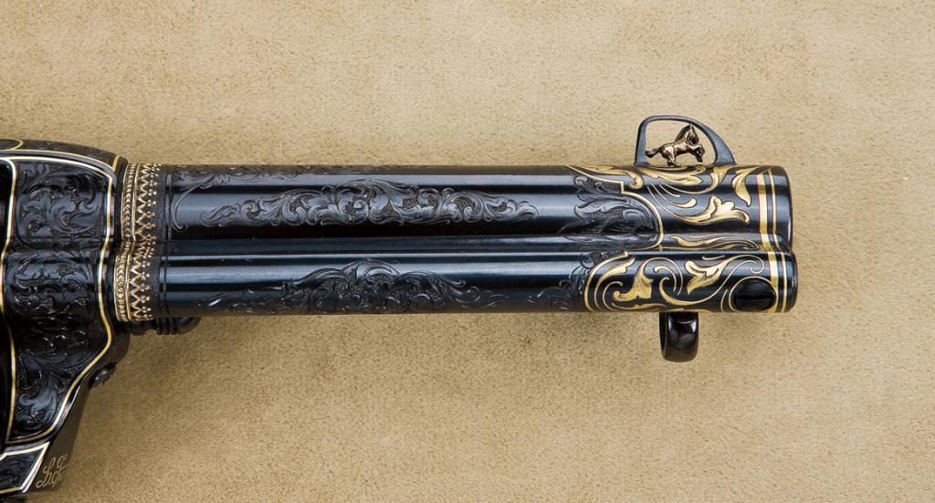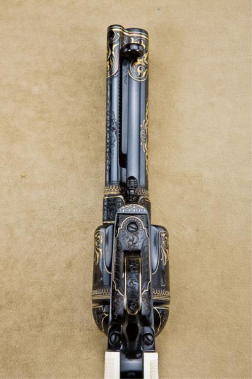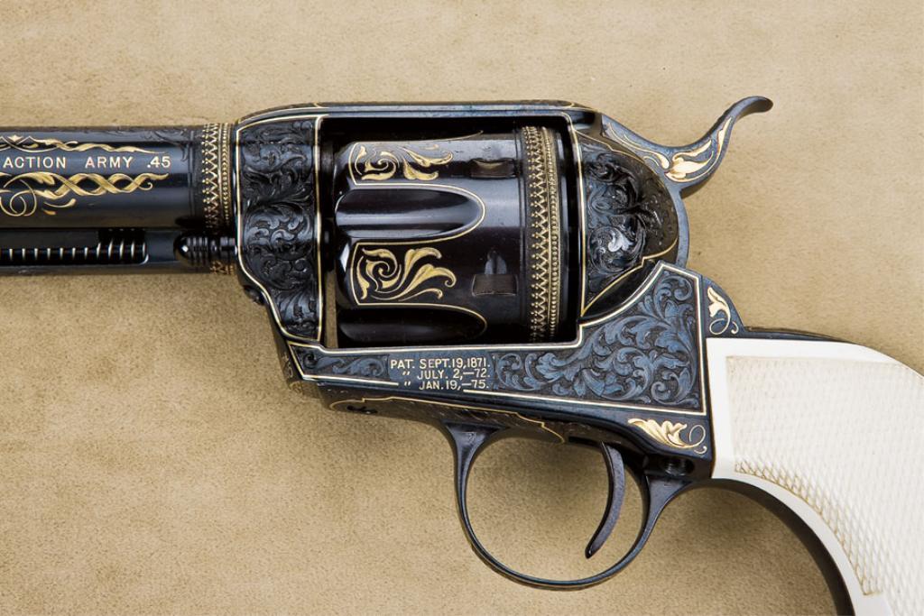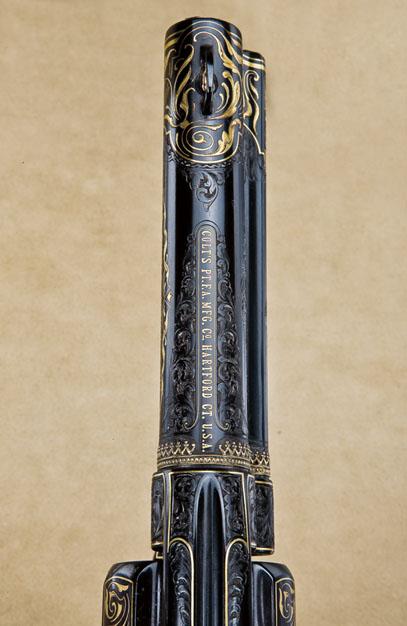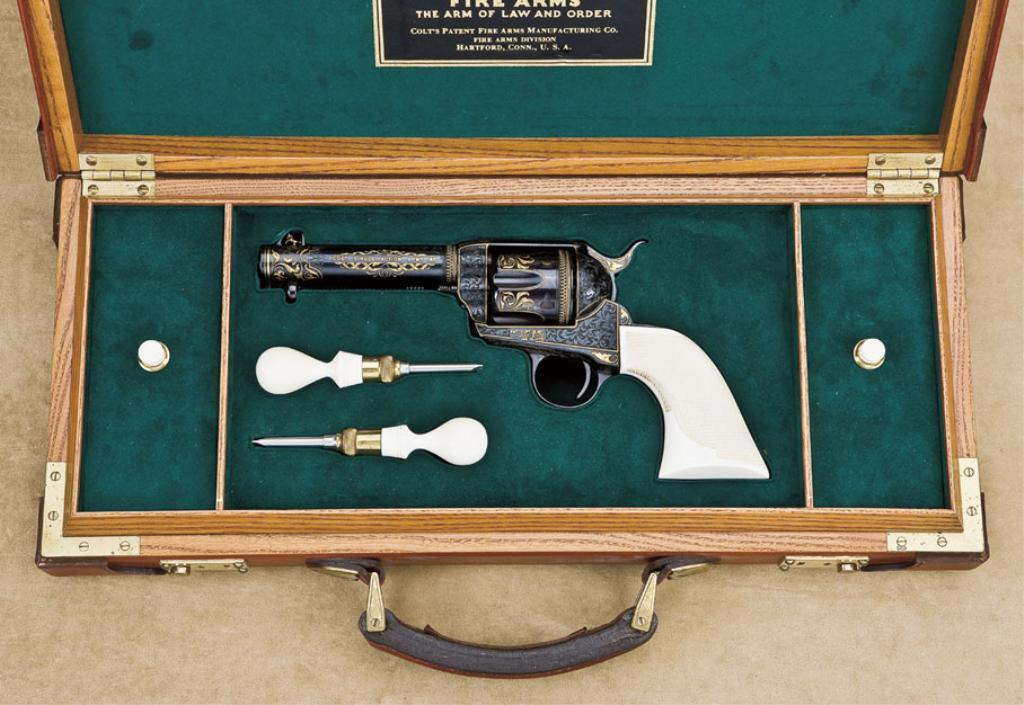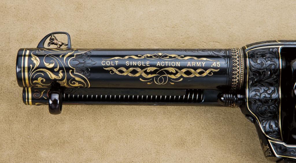 Historically important Leather bound deluxe wood cased custom Colt engraved and 24 K gold inlaid SAA revolver, by Colt Master engraver Leonard Francolini, .45 cal., 4-3/4" barrel, blue finish, custom finely checkered ivory grips, #99999. This gun is in like new condition with an outstanding compliment of scroll engraving and gold inlays and borders that cover every portion of this firearm. The barrel assembly has extensive deluxe gold banding and inlaid scrolling of the finest quality with both the barrel address and left side caliber designation also being gold inlaid; the breech of the barrel and ejector rod housing are ornamented in raised gold wire; the frame is extensively engraved with fine inlaid gold bordering, the three line patent dates are gold inlaid, the unique serial number is gold inlaid and Francolini signed the front of the frame in gold inlay with the date of his work, 1995. The cylinder is gold inlaid, bordered and the rear of the cylinder matches the same raised gold wire application found at the breech end of the barrel assembly previously mentioned; the back strap and trigger guard are also delicately engraved and gold inlaid; the grips show fine checkering, beautiful graining and a mellow ivory color. This gun also has a unique history that is covered in detail in an accompanying letter from Jim Alaimo basically indicating that one of the supervisors in the Colt Custom Workshop tied up the last available serial number for the third generation of Colt SAA and sometime later sold the gun to Jim Alaimo, former Superintendent of the Colt Custom gun shop. Jim then had engraver Francolini perform his most outstanding work on this firearm. It is also importantly noted in Jim's letter that shortly after this gun was produced at the old original Colt factory in Hartford, Connecticut, the premises were vacated and all the machinery and employees moved to a newer facility outside town. A copy of a factory letter dated September 29, 1998 is also included. The deluxe casing was accomplished by renowned case maker Marvin Huey of Kansas City. It is a form fitted leather bound oak case with green billiard ultra suede French fitted interior with two hand- made screw drivers fitted with ivory handles and tow compartments fitted with ivory lid pulls. The case is contained further in a leather bound canvas protective carrying cover similar to those found accompanying high end cased shotguns or double rifles. From a historic as well as an artistic standpoint, this is truly a one-of-a-kind Colt and worthy of prominence in any private or museum collection. Est.: $20,000-$40,000.
