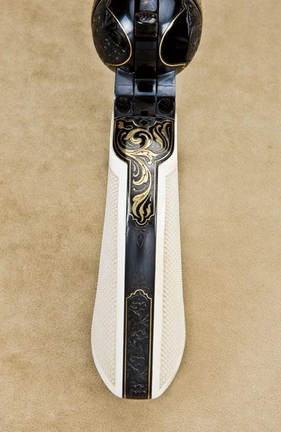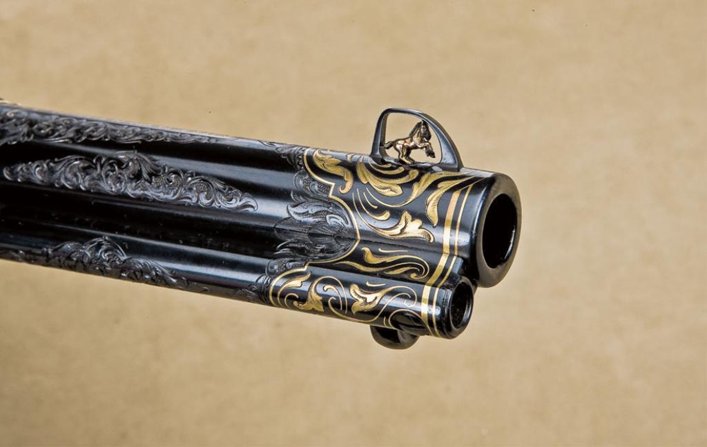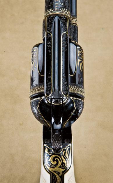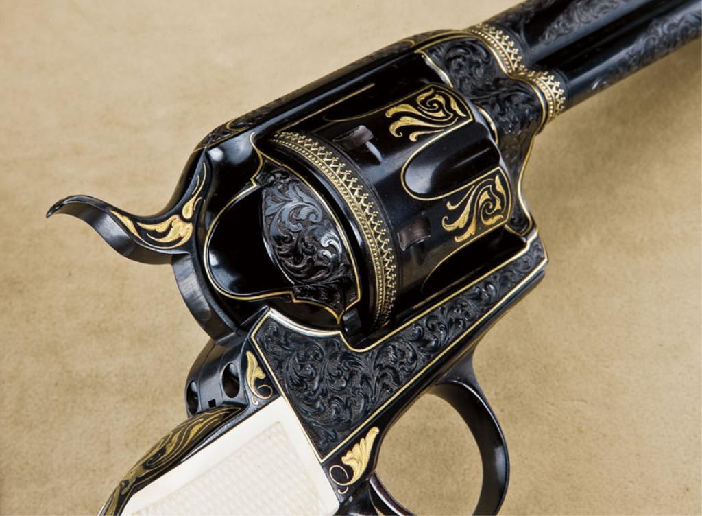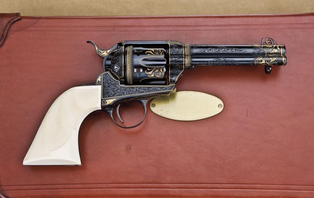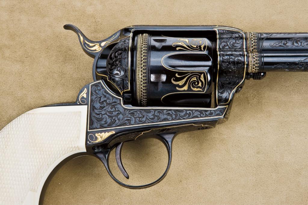 Historically important Leather bound deluxe wood cased custom Colt engraved and 24 K gold inlaid SAA revolver, by Colt Master engraver Leonard Francolini, .45 cal., 4-3/4" barrel, blue finish, custom finely checkered ivory grips, #99999. This gun is in like new condition with an outstanding compliment of scroll engraving and gold inlays and borders that cover every portion of this firearm. The barrel assembly has extensive deluxe gold banding and inlaid scrolling of the finest quality with both the barrel address and left side caliber designation also being gold inlaid; the breech of the barrel and ejector rod housing are ornamented in raised gold wire; the frame is extensively engraved with fine inlaid gold bordering, the three line patent dates are gold inlaid, the unique serial number is gold inlaid and Francolini signed the front of the frame in gold inlay with the date of his work, 1995. The cylinder is gold inlaid, bordered and the rear of the cylinder matches the same raised gold wire application found at the breech end of the barrel assembly previously mentioned; the back strap and trigger guard are also delicately engraved and gold inlaid; the grips show fine checkering, beautiful graining and a mellow ivory color. This gun also has a unique history that is covered in detail in an accompanying letter from Jim Alaimo basically indicating that one of the supervisors in the Colt Custom Workshop tied up the last available serial number for the third generation of Colt SAA and sometime later sold the gun to Jim Alaimo, former Superintendent of the Colt Custom gun shop. Jim then had engraver Francolini perform his most outstanding work on this firearm. It is also importantly noted in Jim's letter that shortly after this gun was produced at the old original Colt factory in Hartford, Connecticut, the premises were vacated and all the machinery and employees moved to a newer facility outside town. A copy of a factory letter dated September 29, 1998 is also included. The deluxe casing was accomplished by renowned case maker Marvin Huey of Kansas City. It is a form fitted leather bound oak case with green billiard ultra suede French fitted interior with two hand- made screw drivers fitted with ivory handles and tow compartments fitted with ivory lid pulls. The case is contained further in a leather bound canvas protective carrying cover similar to those found accompanying high end cased shotguns or double rifles. From a historic as well as an artistic standpoint, this is truly a one-of-a-kind Colt and worthy of prominence in any private or museum collection. Est.: $20,000-$40,000.