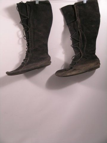 A pair of medieval boots used on the History Channel's 'Conquest' TV series, and various theatrical productions. The boots are calf-high and made from black suede leather, with black rubber soles and lace-up shoestrings. The boots do show some wear. For use with any number of medieval costumes.