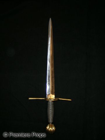 A brass handled dagger used in theatrical productions and History Channel's 'Conquest' TV series. The dagger features a steel blade embedded in a brass handle with small, tightly woven steel cable on the hand grip. The blade has some slight chips but is still very sharp. (measures approx. 20 1/2" long)