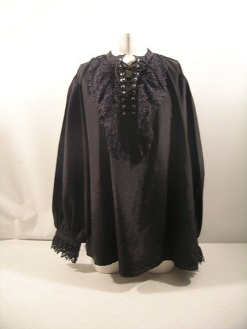 A black frilled collar-less shirt from the History Channel's 'Conquest' TV series. This long sleeve shirt is made from black silk material with a laced pattern sewn onto the chest, with a thin black string for lacing up. The shirt is a size S/M and labels inside read 'dry clean only' and 'Museum Replicas Ltd.'