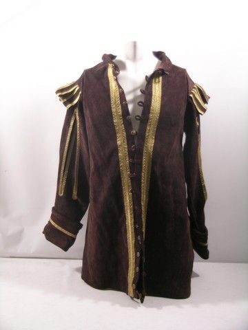 From various theatrical productions and the History Channel's 'Conquest' TV series, this is a heavy brown leather 'Musketeers' style coat. The long sleeve jacket is made from thick suede with gold patterned stitching adorning the shoulders, arms and lapel front. The arm sleeves are 'open air' style and the jacket is fitted with ornate brass buttons that fasten into small leather straps. Label inside reads 'Museum Replicas Ltd.' and has size S and M labels. A very sturdy and royal looking piece.
