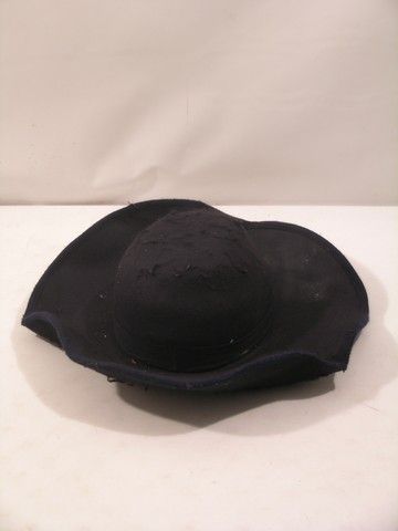 This is a 'Musketeers' style hat used during theatrical productions and on the History Channel re-enactment series 'Conquest.' The hat is made from black fabric over a thick canvas type mesh, and shows wear under the brim. (measures approx. 16" across)